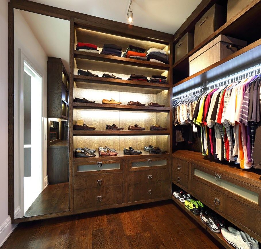 Pour faciliter la recherche de la bonne chose, dans le vestiaire, vous devez disposer d’un éclairage de haute qualité. Les lampes à lumière chaude ou neutre sont parfaites. Les spots à LED montés sur des étagères ne seront pas superflus ici. Les luminaires classiques peuvent être remplacés par de petits projecteurs pouvant être orientés dans n'importe quelle direction.