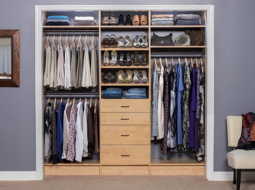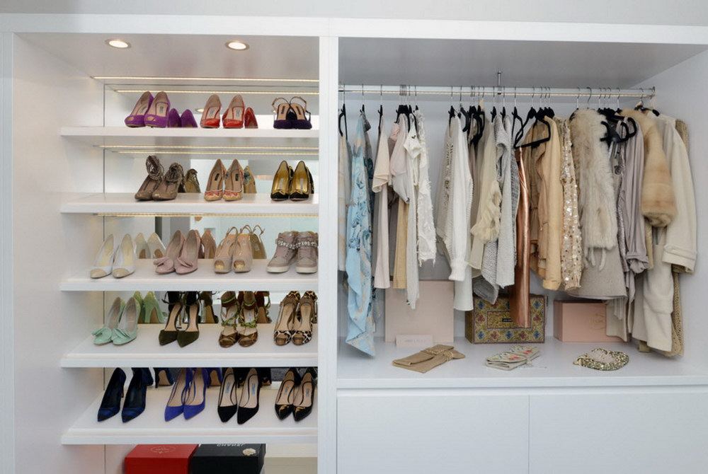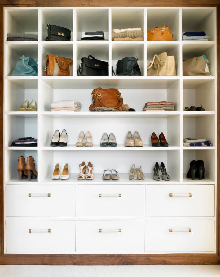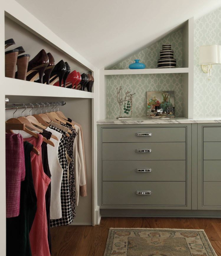 La partie supérieure du vestiaire est généralement conçue pour stocker des couvertures, des oreillers, des sacs et des articles de saison. Les parapluies, les gants, les chapeaux et les sacs peuvent être rangés légèrement au-dessus du niveau des yeux. La partie centrale est occupée par des étagères et des cintres sous lesquels sont installées des boîtes à vêtements. Le niveau inférieur sera occupé par des chaussures. Il est plus pratique de le stocker sur des structures en rotation ou sur des étagères, dont l’angle est compris entre 45 et 60 degrés.