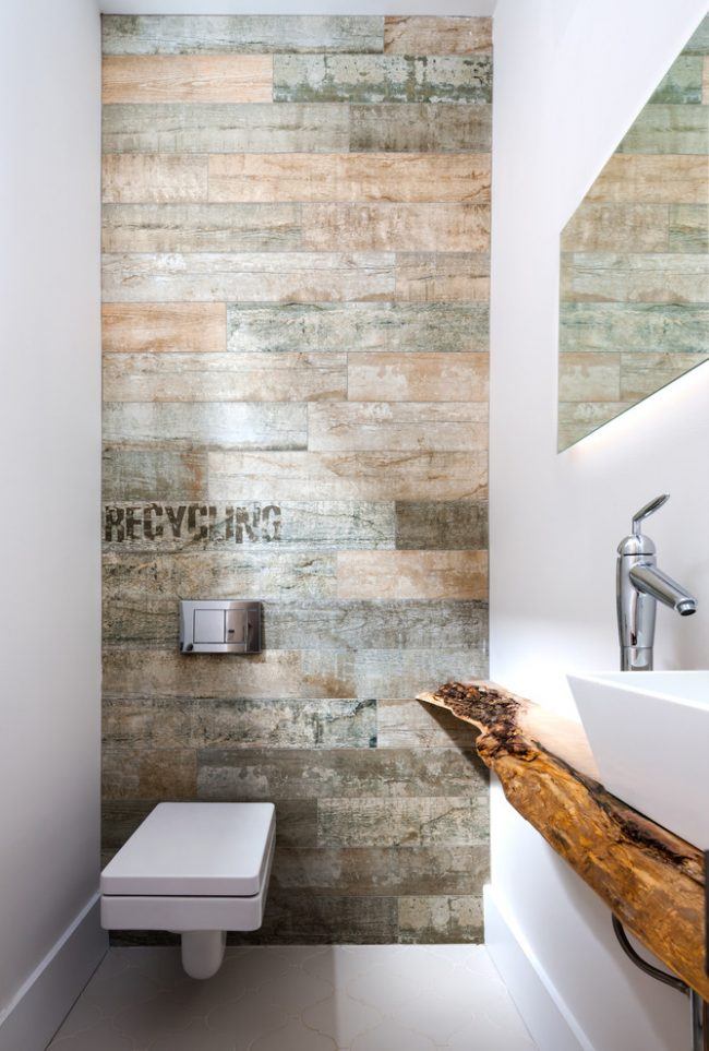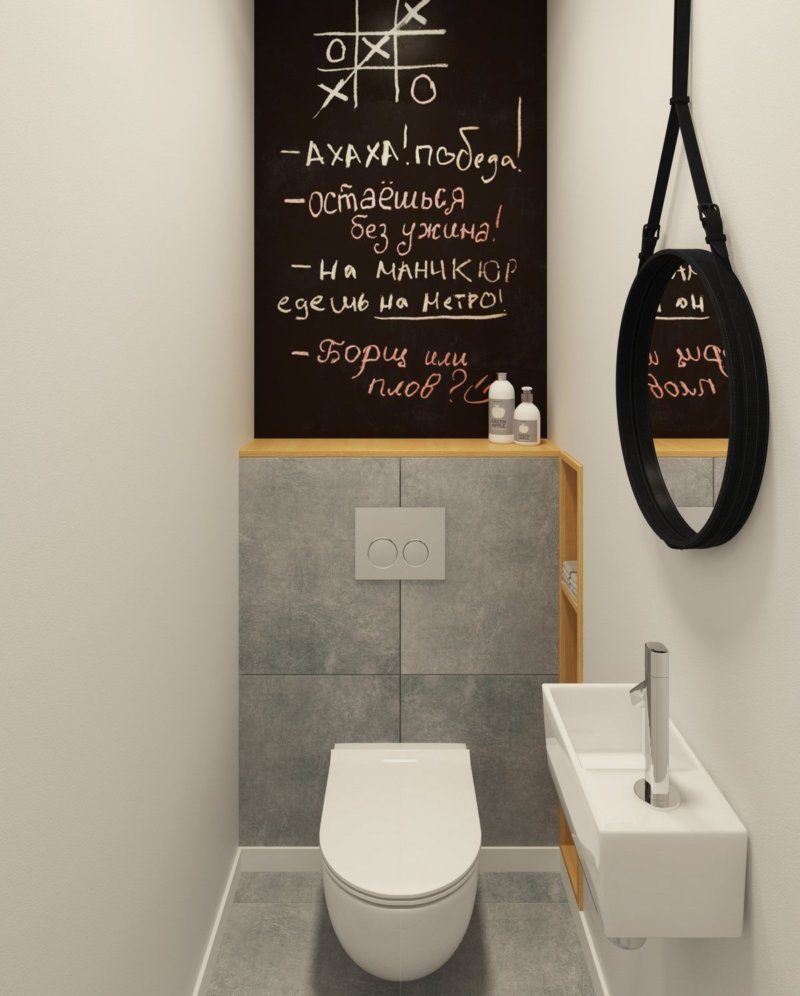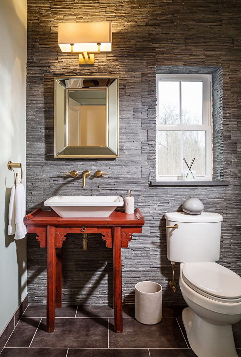 Pour une petite toilette, la pierre décorative, le papier peint en vinyle, la céramique émaillée, les panneaux en bois / plastique deviendront un revêtement pratique et original. Lors de la conception, il convient de privilégier les tons calmes (gris, bleu, blanc, beige, sable), associant des couleurs neutres et lumineuses - vert avec vert clair, blanc avec noir, gris avec blanc. Une solution aussi simple élargira visuellement l'espace.