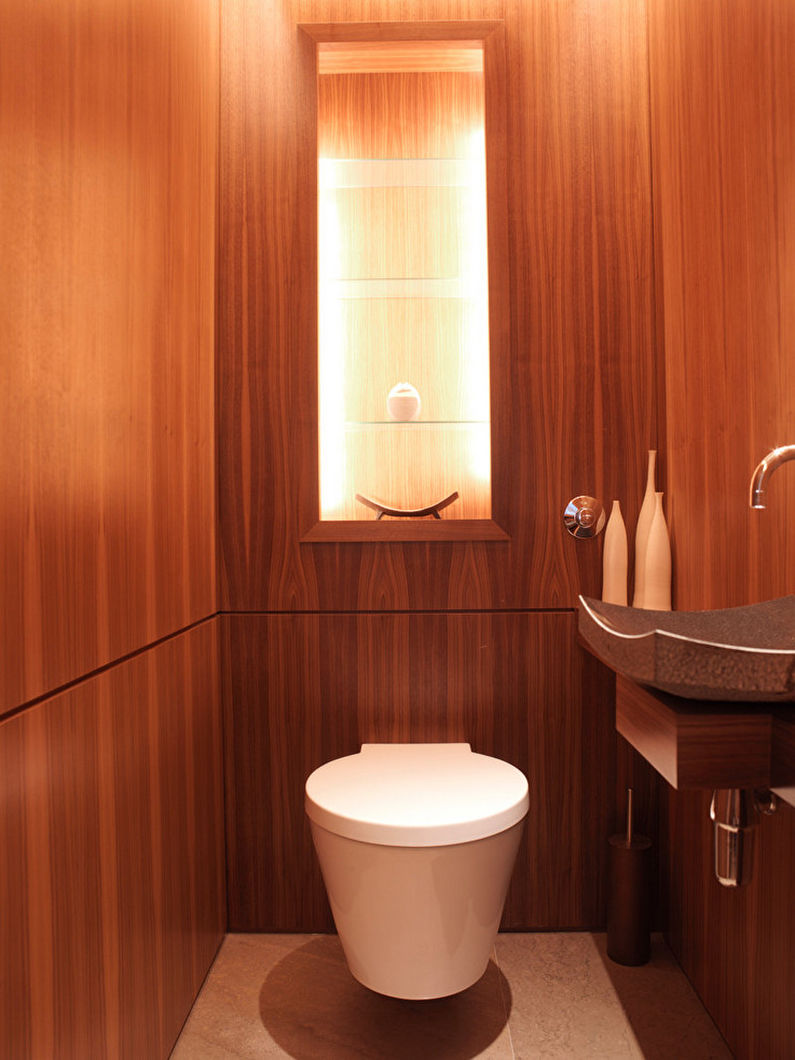 Pour une petite toilette, le confort et la simplicité fonctionnelle sont considérés comme la combinaison idéale. Le minimalisme accueille les contrastes de lumière des nuances sombres et claires, les matériaux naturels pour la décoration (pierre, bois, verre), l’absence de décorations volumineuses. Ils peuvent être remplacés par des panneaux au plafond et des lampes compactes décoratives.
