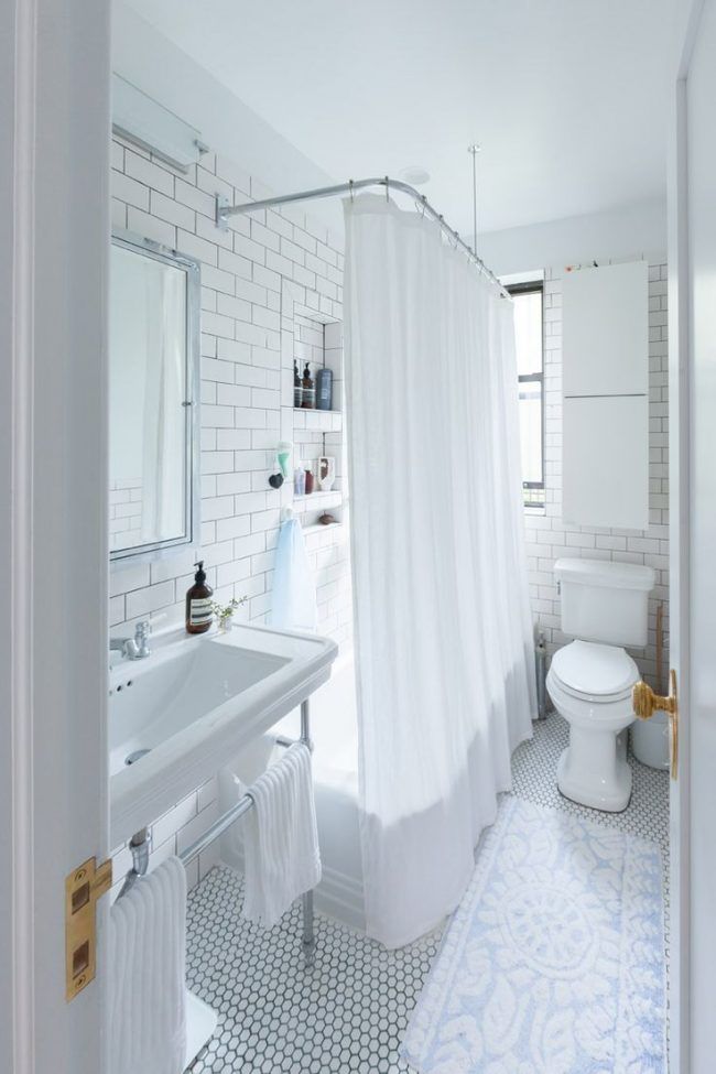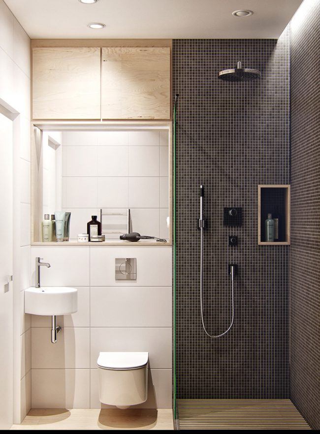 Dans la rangée allongée ou au centre du plafond, des projecteurs peuvent être intégrés. L'éclairage supplémentaire peut être une bande de LED collée à un miroir ou à un éclairage de sol. Avec un éclairage suffisant, une petite pièce aura l’air cosy plutôt que sombre et étroit.