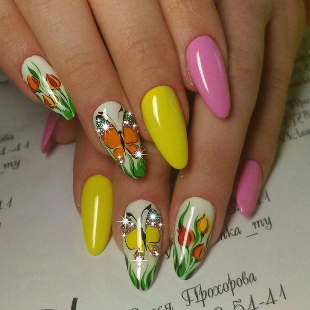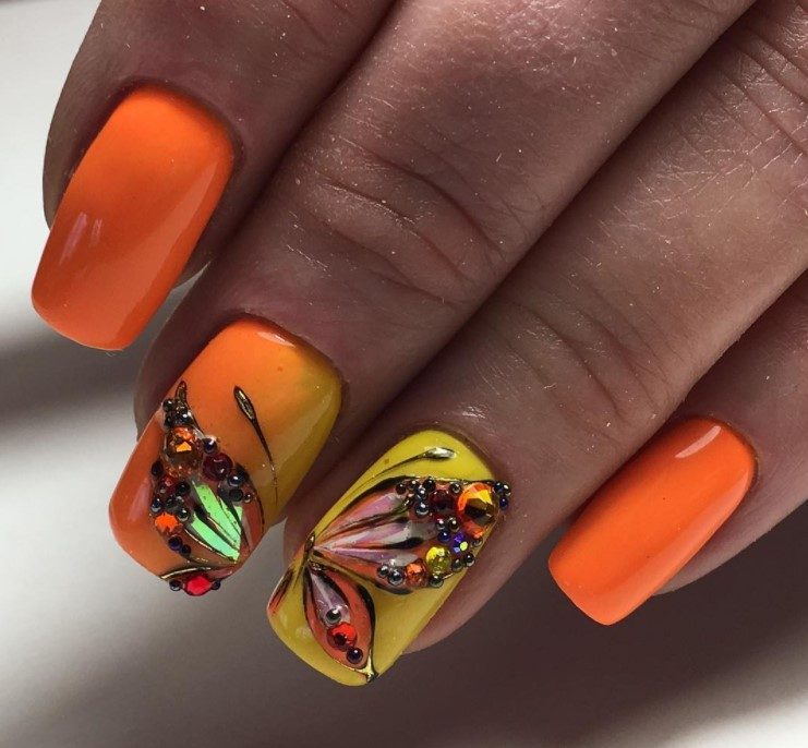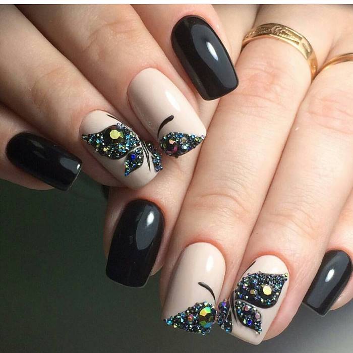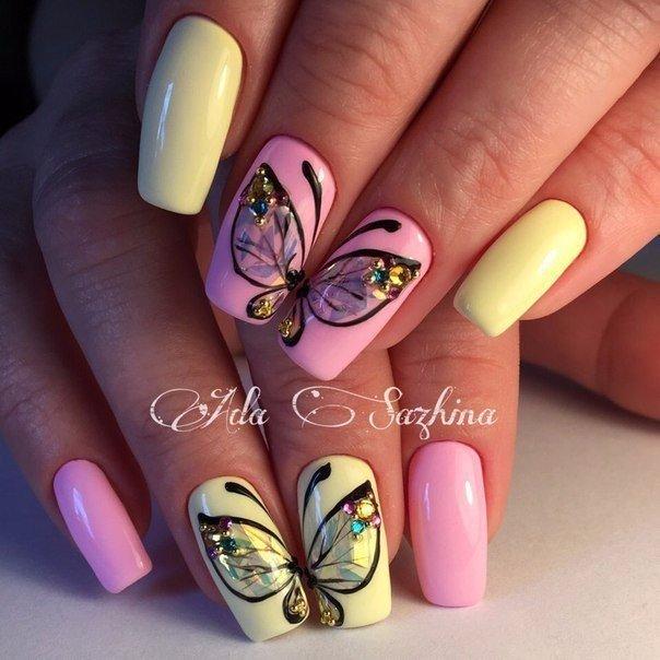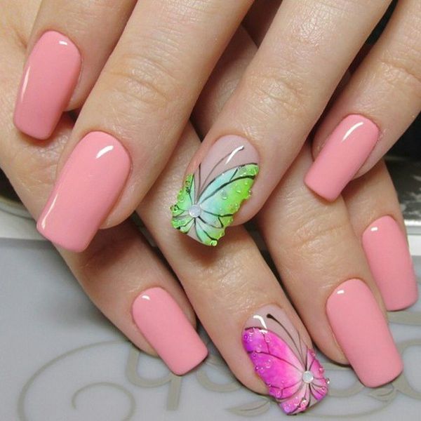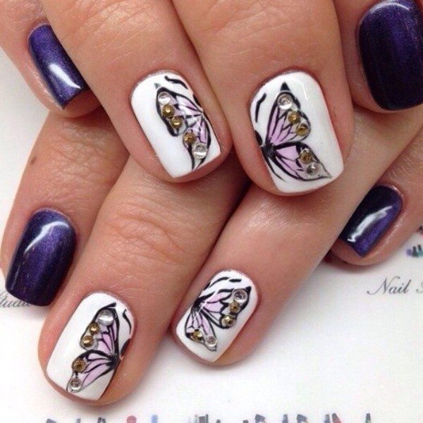 Le sujet des papillons fragiles sur les ongles est particulièrement important pendant la saison chaude. Les techniques pour réaliser un insecte sont aussi diverses que l'imagination le permet. Dans la nature, plus de deux cent mille espèces de papillons, de mites, de mites. Imaginez combien et quels lépidoptères vous pouvez dessiner chaque jour! Les papillons dans les tons neutres ont l'air mieux dans les couleurs vives. Une manucure avec un motif de papillon semble bien en raison du contraste. Lorsque vous créez un papillon, utilisez des teintes de vernis éclatantes. Vous pouvez dessiner des papillons qui voltigent sur chaque ongle, vous pouvez dessiner sur un sans nom. Il est également intéressant d’envisager de réduire de moitié les insectes: dessinez une aile sur l’une des clous et la seconde sur l’autre. Évaluez le choix des couleurs dans une manucure avec un motif de papillon.