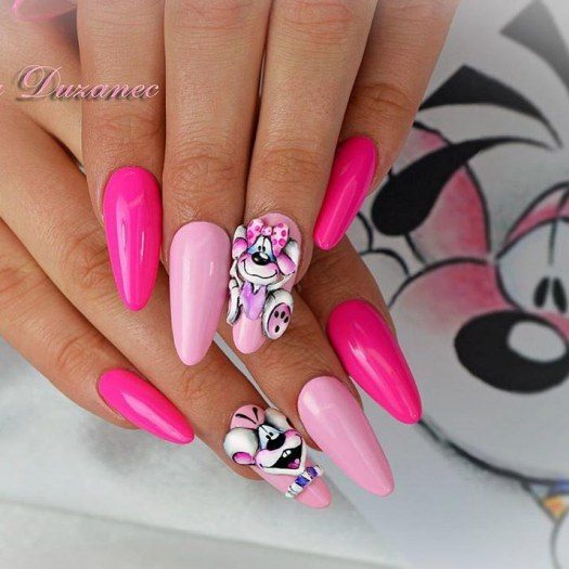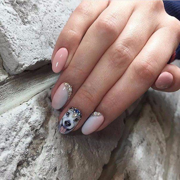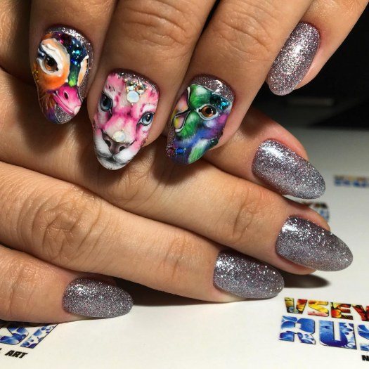 Les petits animaux sur les ongles sont de plus en plus populaires parmi la population féminine jeune. Une telle manucure complétera parfaitement l'image dans un style de rue. Le plus souvent, des chiens et des chats mignons sont dessinés sur les ongles, mais les femmes de la mode ne se limitent pas à un tel choix et préfèrent des visages léopards spectaculaires, des lapins touchants ou un animal populaire de conte de fées tiré de films d'animation modernes tels que sbires et Pokemon. La créativité d'un manucure tout en dessinant différents animaux sur des ongles peut aller en dehors de l'échelle, et donc discuter à l'avance de la palette de taille et de couleur de l'animal. Des exemples d'animaux en manucure sont présentés sur la photo ci-dessous.