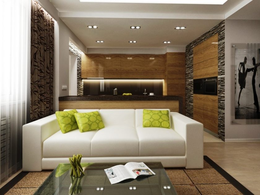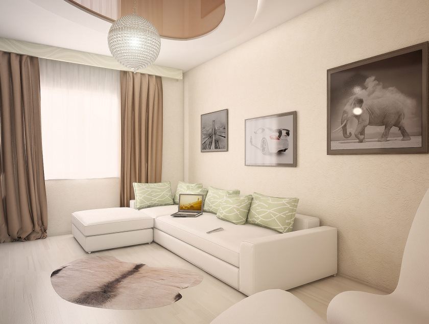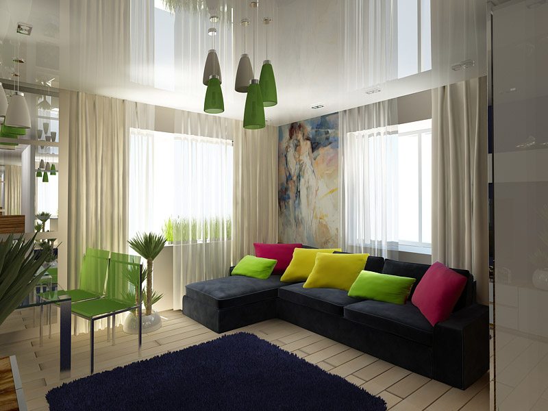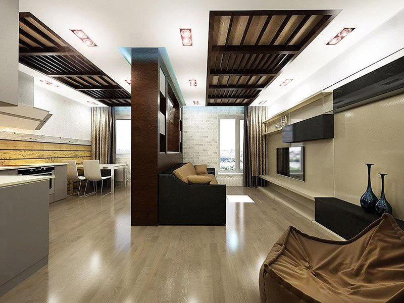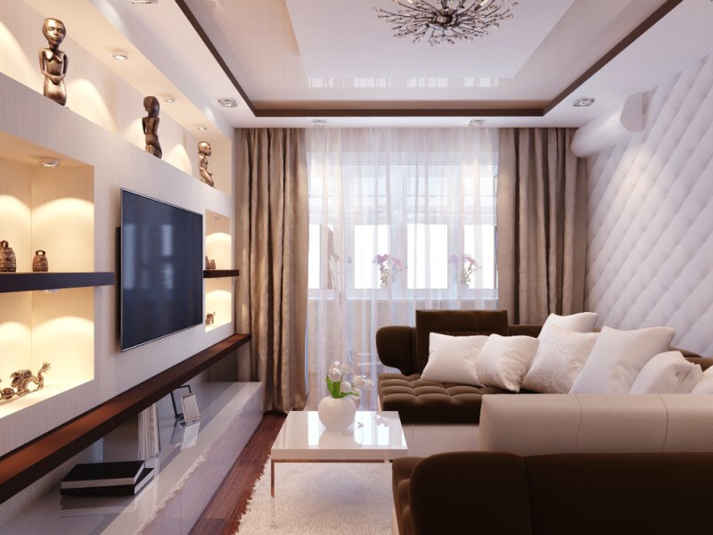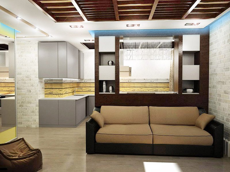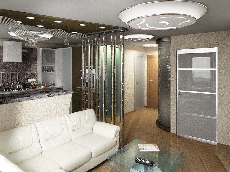 Ici, vous pouvez déjà penser à un zonage rationnel pour rendre la pièce aussi fonctionnelle que possible. Pour ce faire, utilisez des cloisons, des niches à air, des surfaces en verre ou en miroir.
