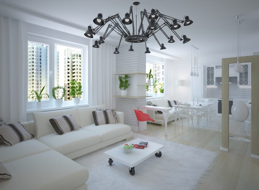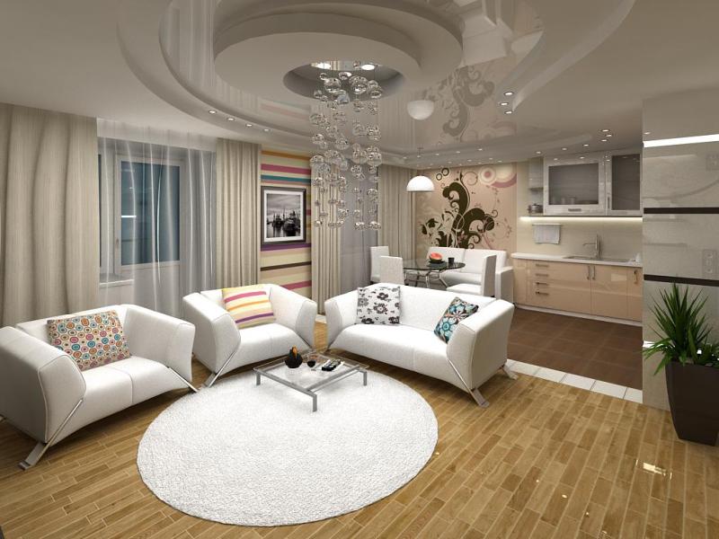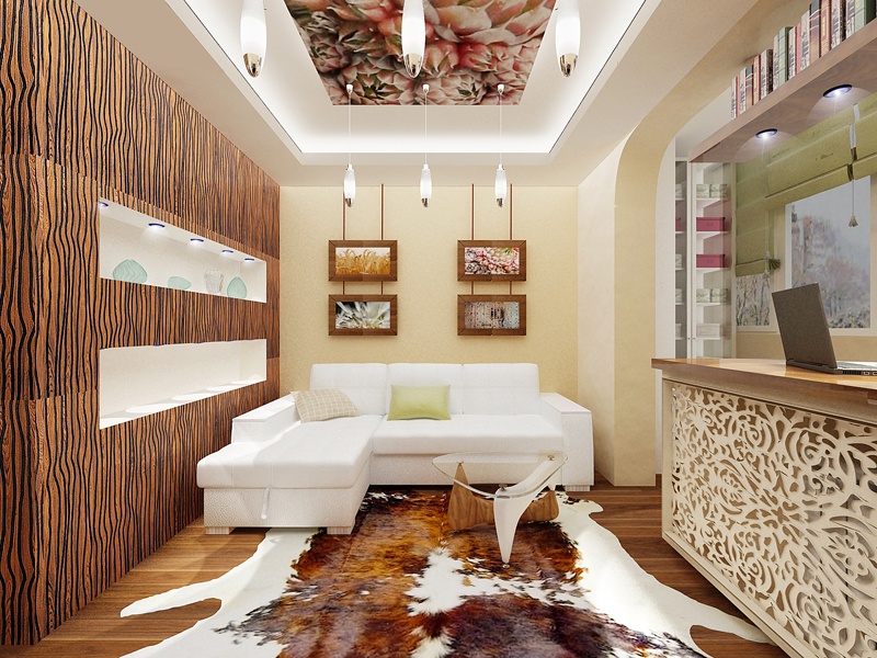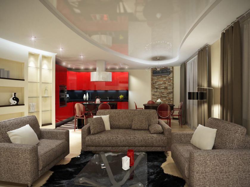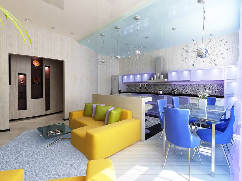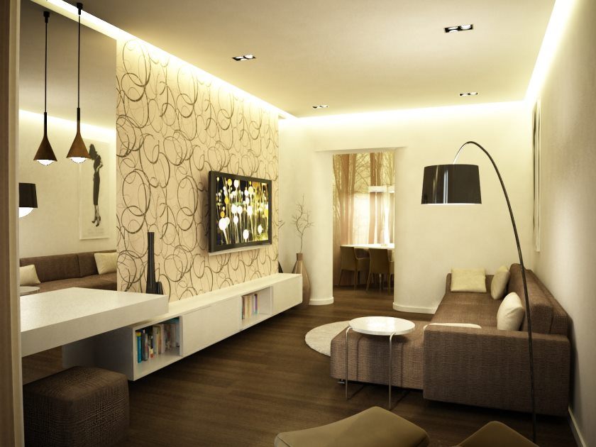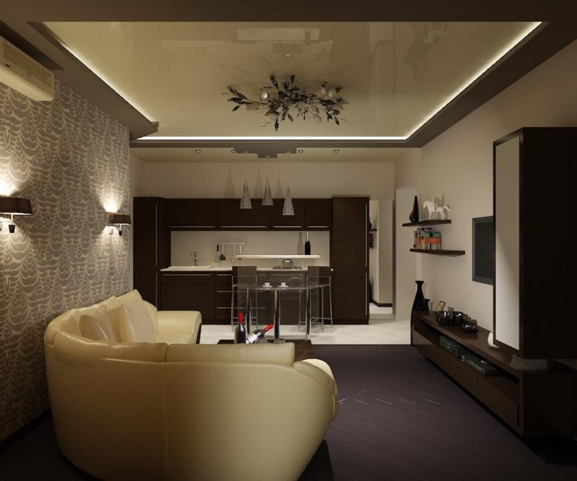 Ici, vous pouvez déjà penser à un zonage rationnel pour rendre la pièce aussi fonctionnelle que possible. Pour ce faire, utilisez des cloisons, des niches à air, des surfaces en verre ou en miroir.