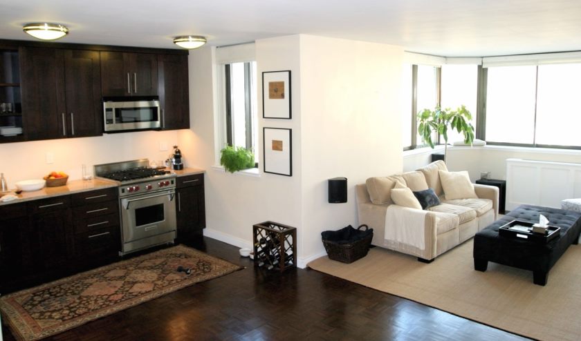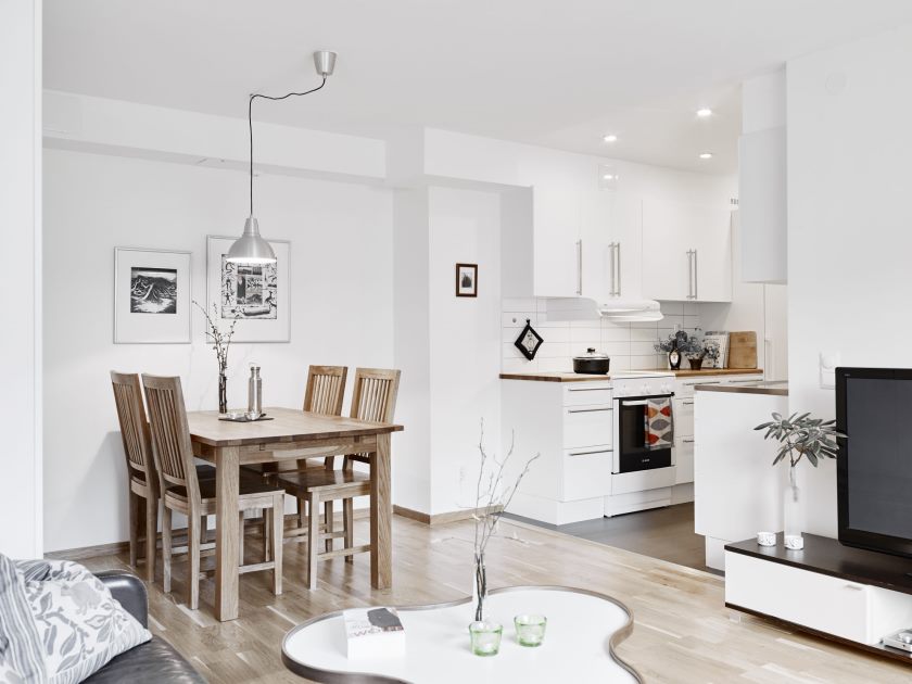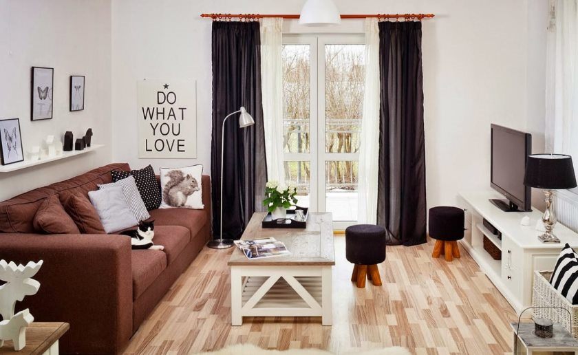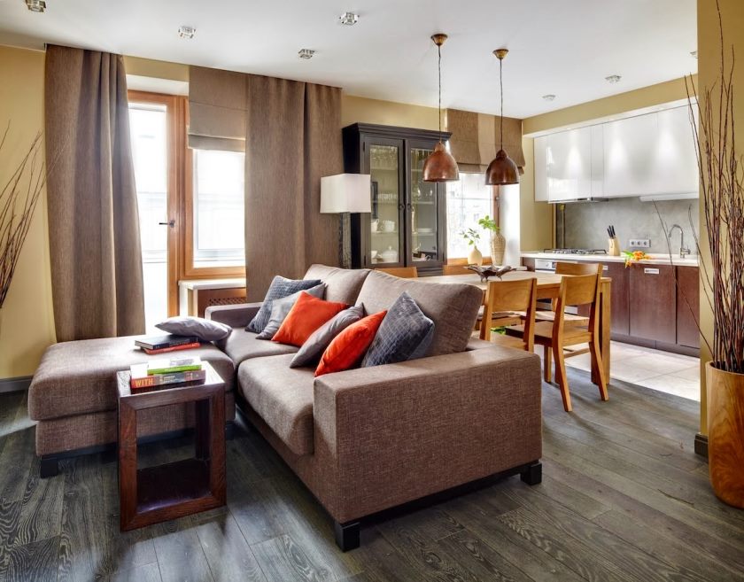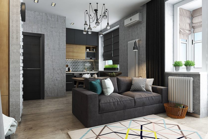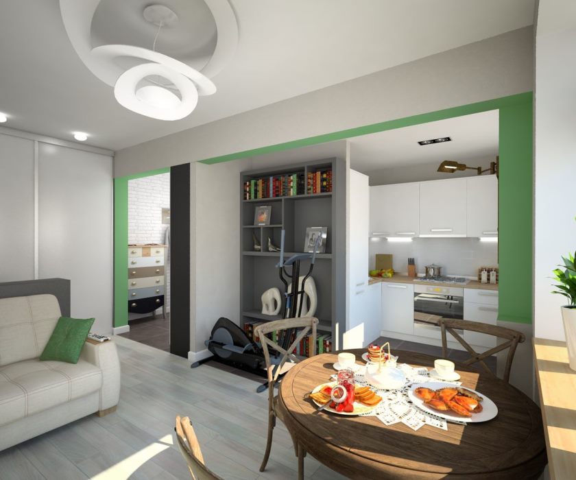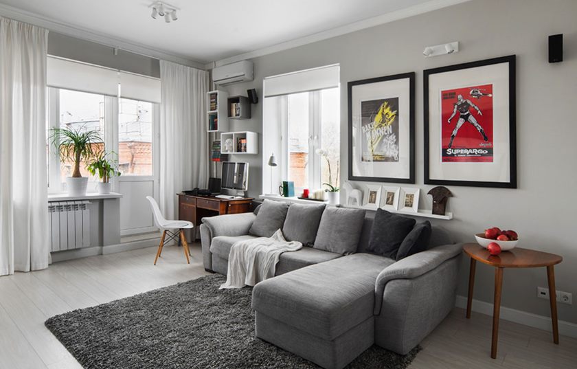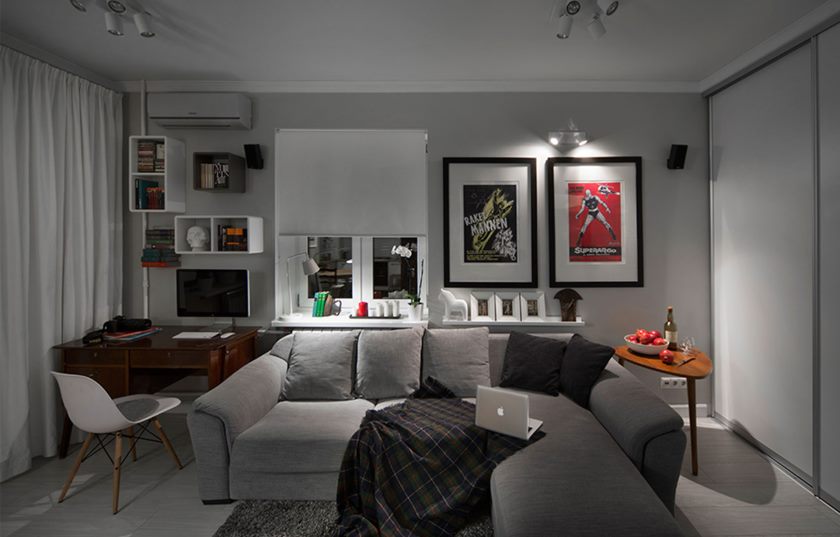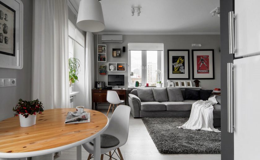 Pour un si petit appartement, vous devez choisir des teintes claires et chaudes qui rendront la maison agréable et confortable. Le style idéal est le minimalisme.