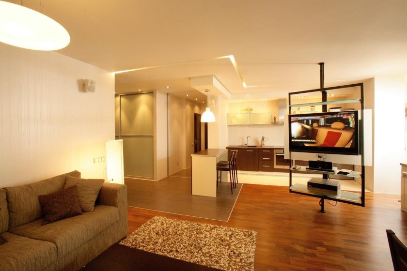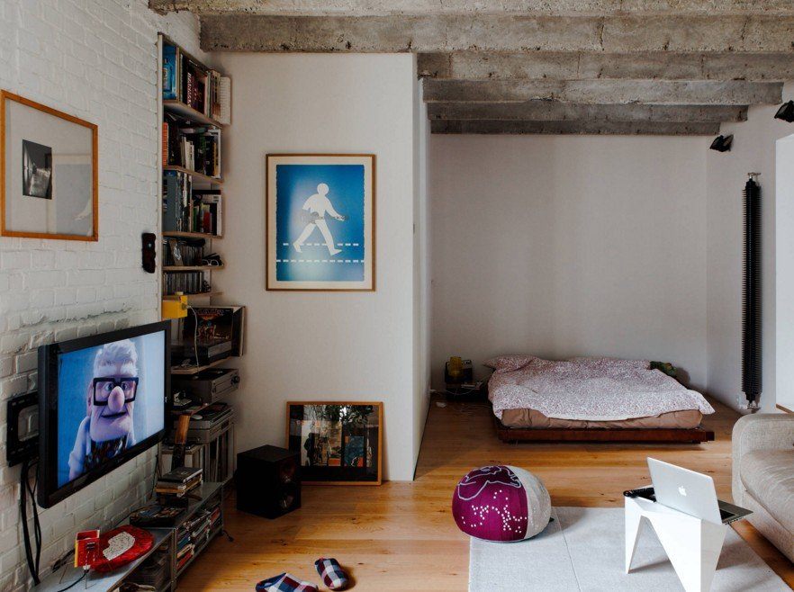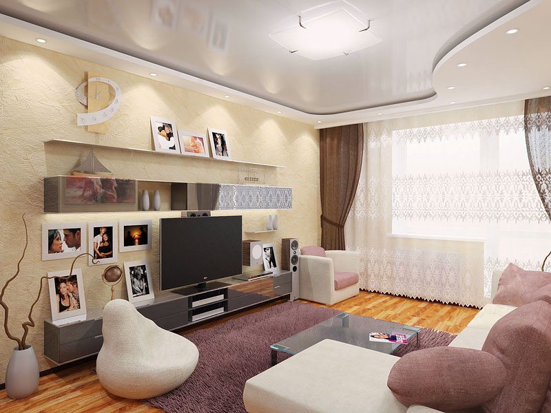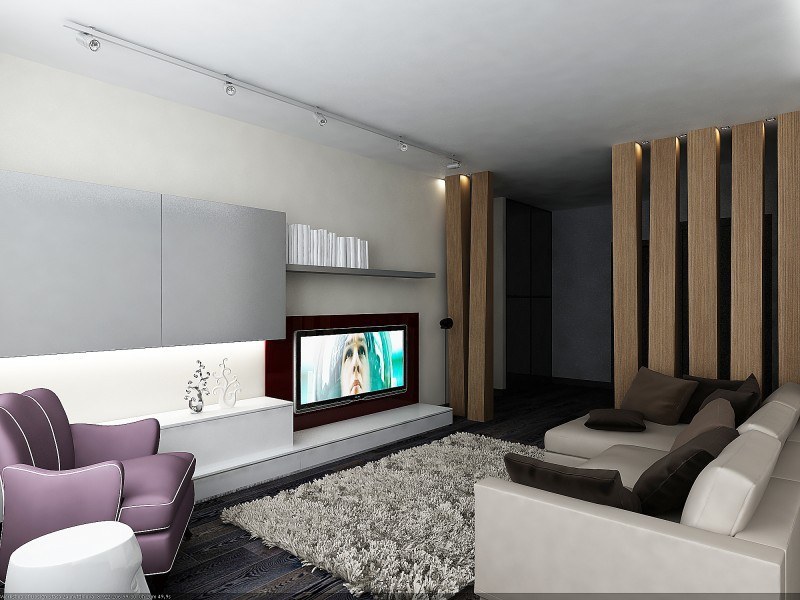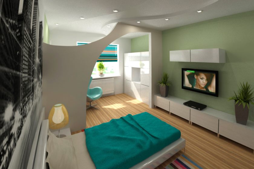 Dans la zone de loisirs, vous pouvez installer un grand lit, en le recouvrant d’une cloison en verre ou en placoplâtre, d’un écran, d’un rideau en textile ou d’autres matériaux. Si la famille a un enfant, il ne devrait pas y avoir de télévision dans la zone de loisirs. Ce sera plus approprié dans la zone des invités, à côté d'un petit canapé pliant.