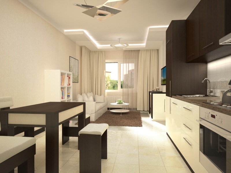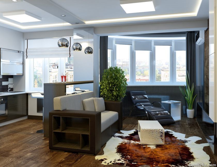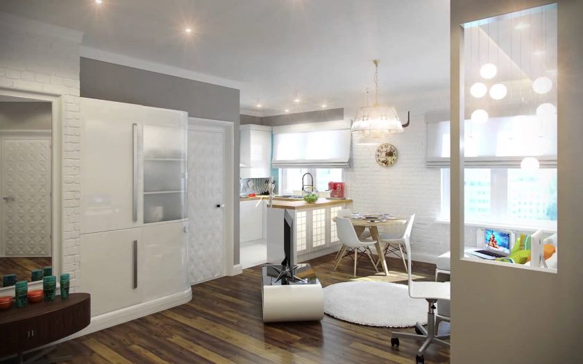 Si un tel appartement se trouve dans un nouveau bâtiment, vous pouvez agrandir l'espace en utilisant cette loggia. Pour ce faire, il doit être isolé et vitré, après quoi il peut servir de salle à manger ou de bureau. Cela permettra de décharger la cuisine et d’utiliser au mieux les mètres carrés libérés.