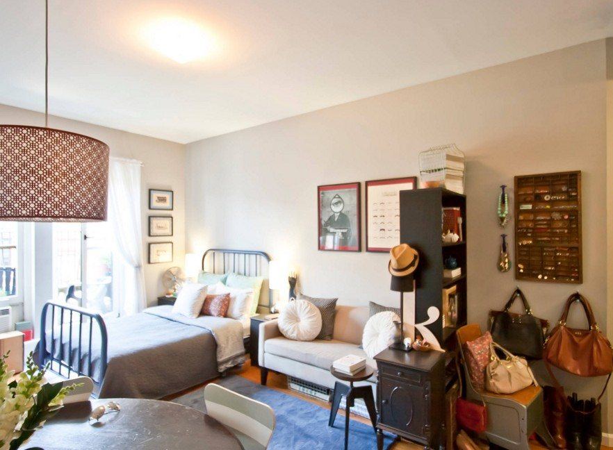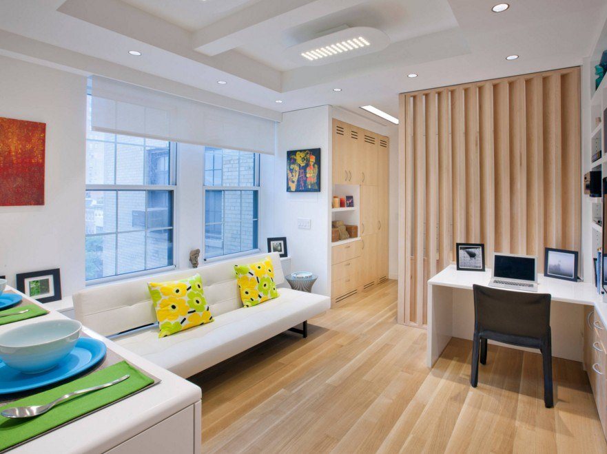 La seule pièce dans un tel appartement a plusieurs fonctions à la fois. C'est une zone de loisirs, une chambre et un bureau. Tous les meubles doivent être compacts et multifonctionnels. Un canapé, un lit et des fauteuils doivent être choisis avec des compartiments conçus pour ranger des objets. La table devrait également être compacte et transformable.