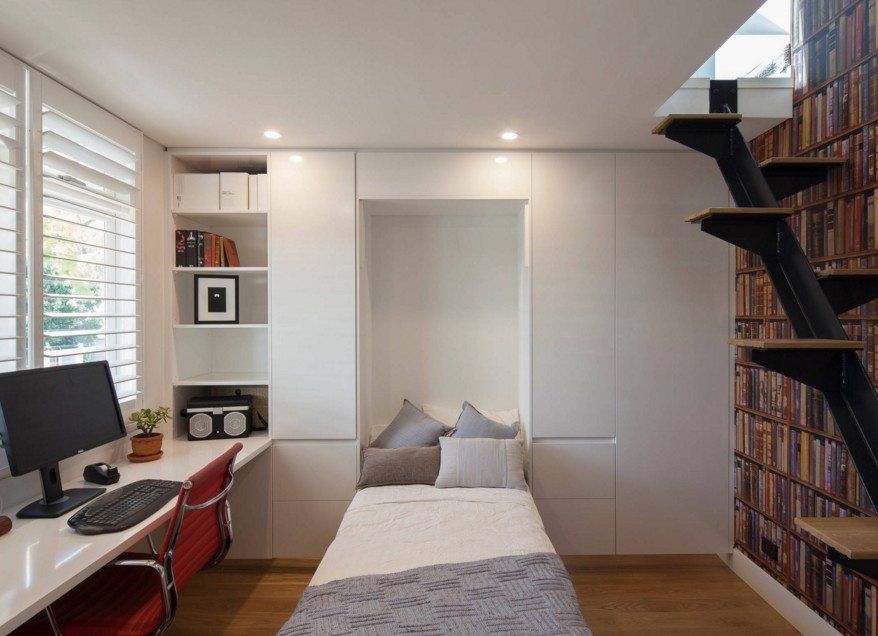 Il est préférable de stocker les objets non pas dans des armoires volumineuses, mais dans un système de stockage multifonctionnel. Les livres et autres petites choses peuvent être cachés dans des étagères hautes à charnières ou étroites. L'option idéale serait les armoires de coin, qui occupent un minimum d'espace libre, mais peuvent se vanter d'être spacieuses. Lors du choix des meubles, faites attention aux options pour les transformateurs.