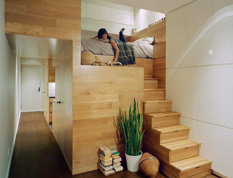 Lorsque vous organisez un appartement dans ce cas, vous devez faire attention au fait qu'aucun coin ne reste vide. Cependant, placer tous les objets le long d'un des murs n'est également pas une option. Quelle que soit la zone de la maison, le système de stockage est avant tout pensé. Cela peut être un podium équipé où un lit ou une table est installé sur le dessus, et où la literie ou d’autres accessoires sont cachés.