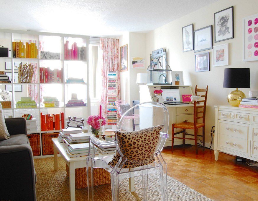 Pas besoin de surcharger le studio avec des éléments décoratifs. Il suffit de placer des objets intéressants à plusieurs endroits et de cacher tout le reste dans des casiers fermés.