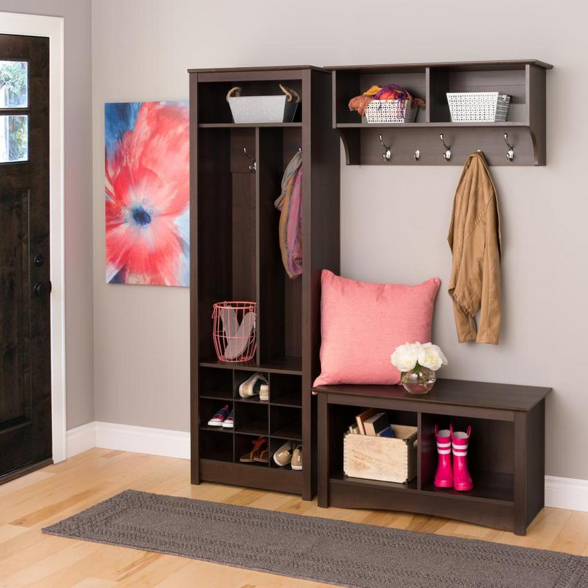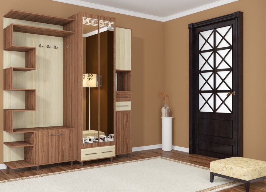 Pour un petit couloir, vous devez choisir un casque blanc. Ces meubles auront l'air moins lourd. Dans les couloirs de taille impressionnante, les systèmes de stockage peuvent être assortis aux couleurs sombres. Mais les murs avec cette conception sont mieux faits la lumière. Les meubles doivent être en harmonie avec le sol.