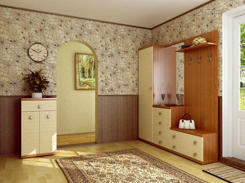 La chose la plus importante dans le couloir est de penser aux endroits où ranger chaussures, vêtements et accessoires. Une variante commune des systèmes de stockage de couloir est des meubles en bois non peints. Un tel ensemble peut accueillir des vêtements de dessus et des chaussures d'une famille de taille moyenne.
