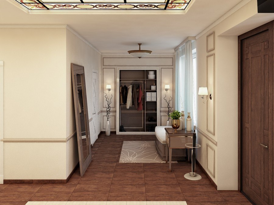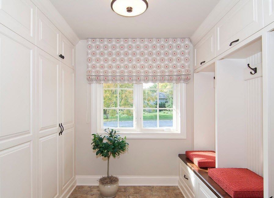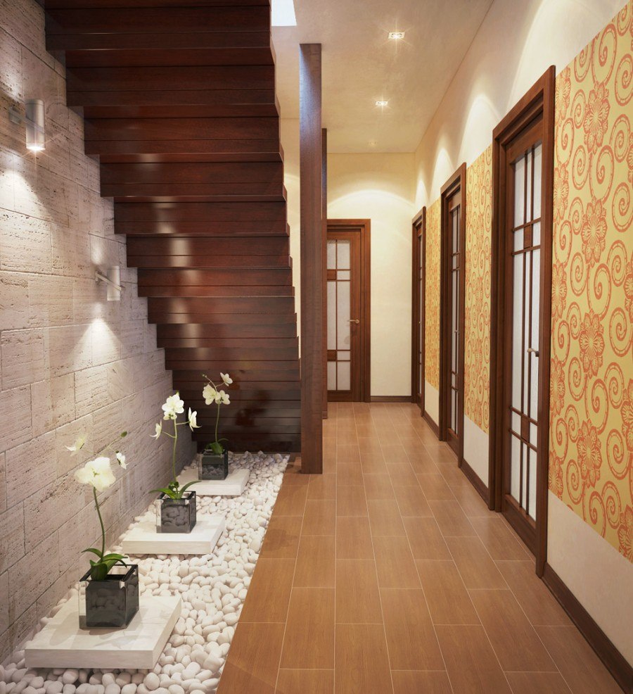Un petit élément de décor nécessaire sera un panier ou un support pour les parapluies. S'il y a une fenêtre dans le couloir, vous devez penser à la draper avec des rideaux (tulle). Vous devez choisir des produits faciles à entretenir. Les stores en métal ou en bambou sont l’option la plus appropriée. L'approche pour choisir un tapis est identique. Les fleurs dans des pots dans un grand couloir la pareront merveilleusement et donneront à la pièce une sensation de fraîcheur et de pureté.