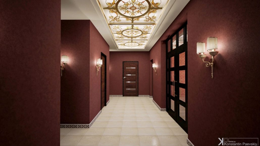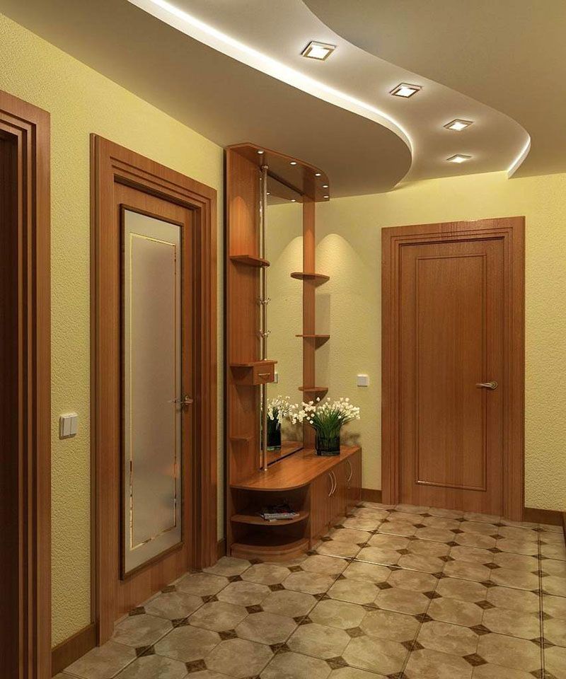 Le plafond dans le couloir est réalisé en fonction des préférences et des capacités financières des propriétaires. Ils peuvent être des types suivants: