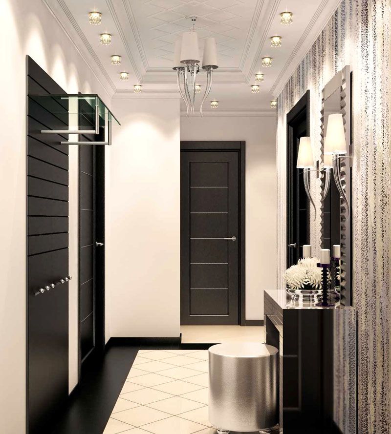 Le choix de l'éclairage dans le couloir dépend de la décoration du plafond. Le système d'éclairage intégré est idéal pour un faux plafond. Le couloir devrait être lumineux. Avec une taille modeste de la pièce, les plafonniers encombrants ne fonctionneront pas.