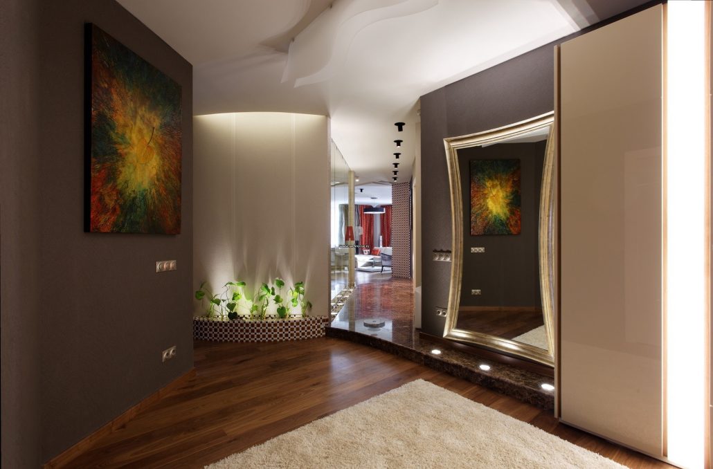 Une partie intégrante de tout couloir est un élément de décor comme un miroir. Après tout, c’est ici que les derniers préparatifs ont lieu avant de sortir. Pour vous convaincre de l'aide décisive, bien entendu - un miroir. Et il sert également de décoration de l'intérieur de la pièce et élargit visuellement l'espace.