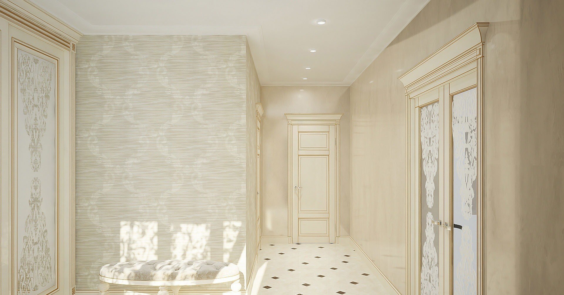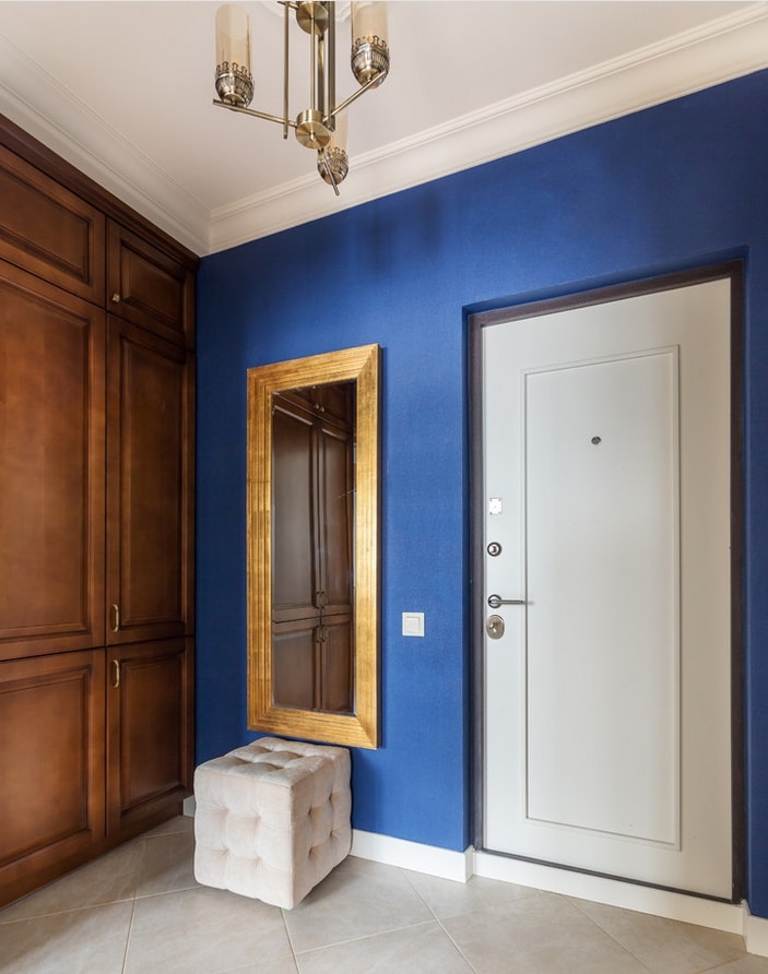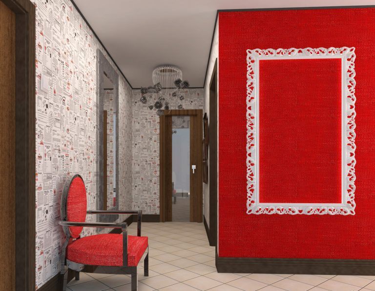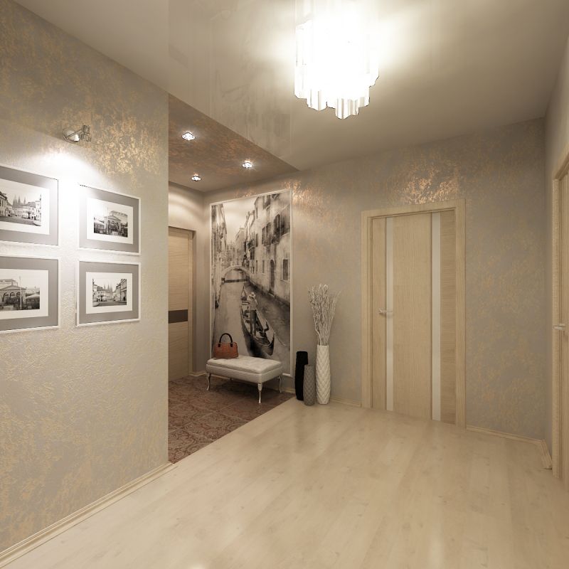 Papier peint liquide. C'est l'option la plus pratique pour le hall d'entrée. Il y a beaucoup de jambages, d'ouvertures et de coins dans cette pièce. En cas de dommage sur une partie du papier peint, celui-ci peut être facilement remplacé.