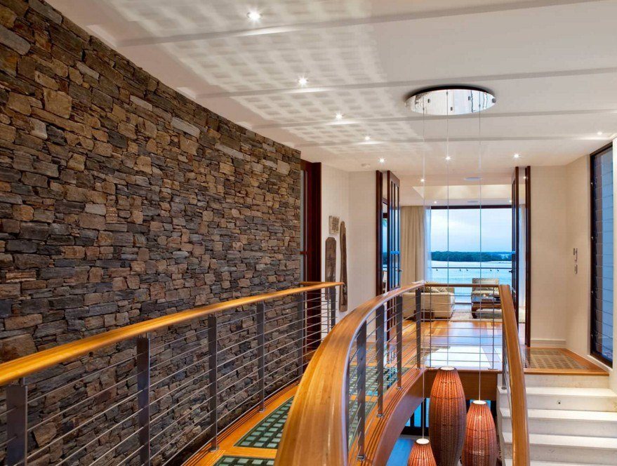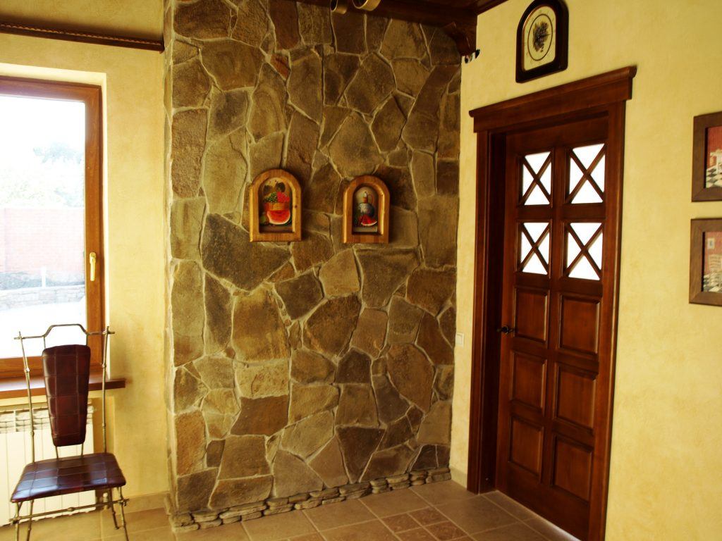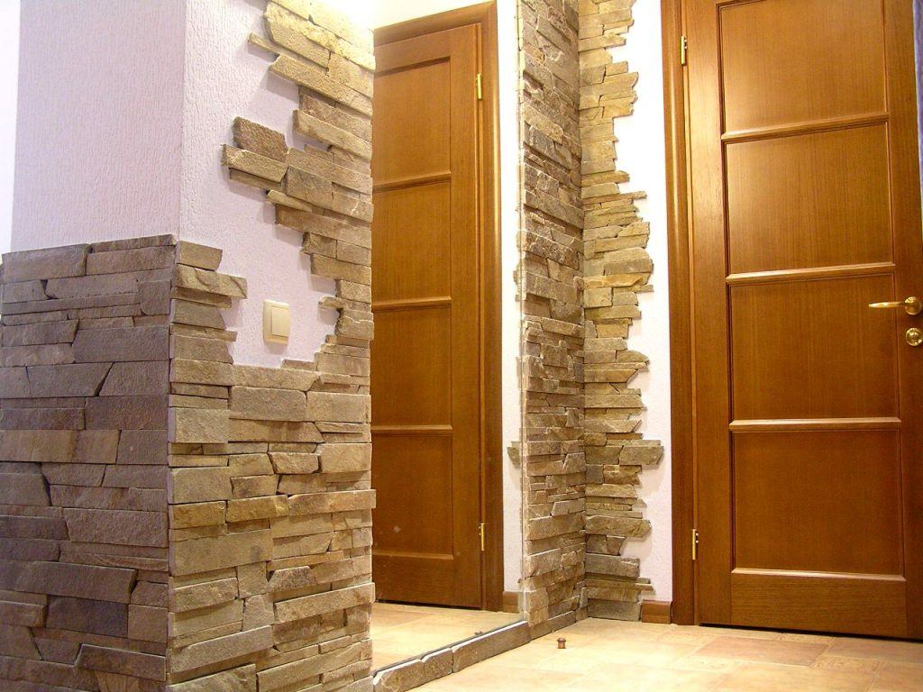 La décoration du couloir est assez impressionnante avec des pierres artificielles ou naturelles. Tout comme pour la création d'un mur de briques, des spécialistes aideront à décorer les murs avec de la pierre. Mettez-le non pas un mur, mais plusieurs. Vous devez décorer sous forme de petites inclusions. Des fragments de pierre sont généralement placés autour de la porte d'entrée et en face de celle-ci. Ce mouvement de conception attire immédiatement l'attention.