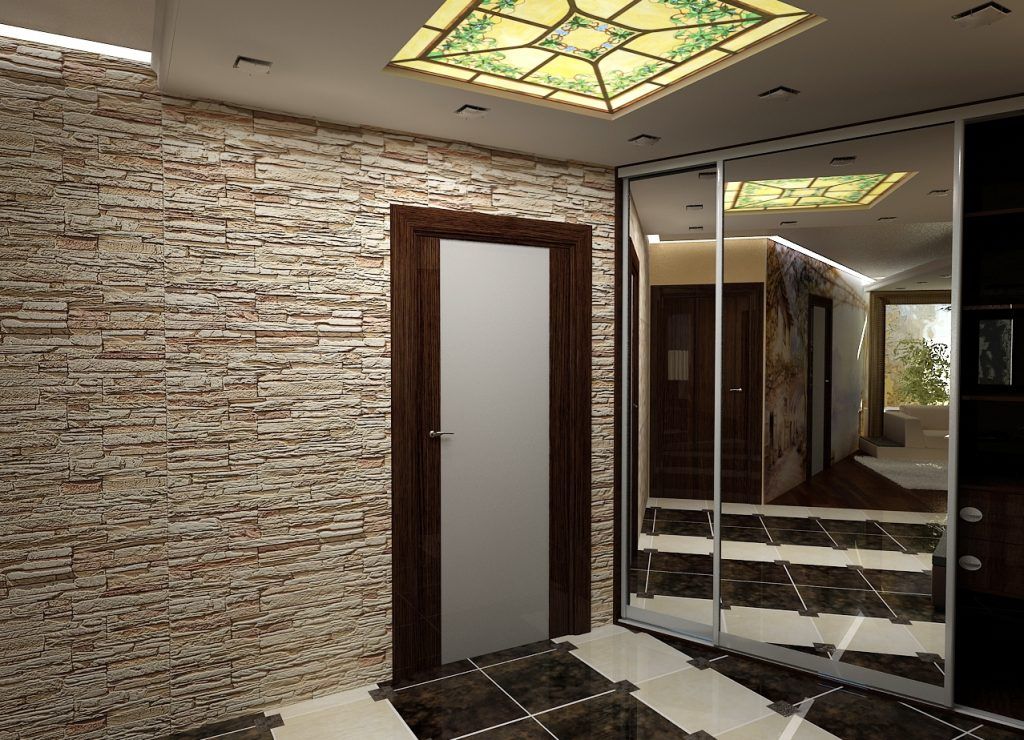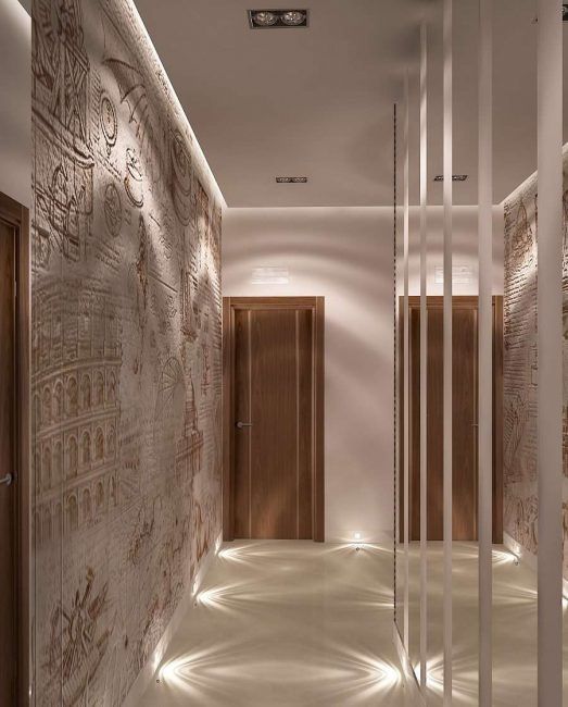 Les murs dans le couloir ou le couloir peuvent être finis avec de la pierre, du plâtre décoratif, du papier peint, des panneaux muraux, décorés sous forme de maçonnerie ou en utilisant une combinaison de ces matériaux.