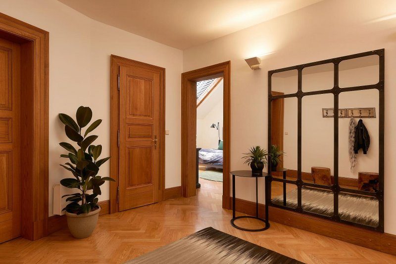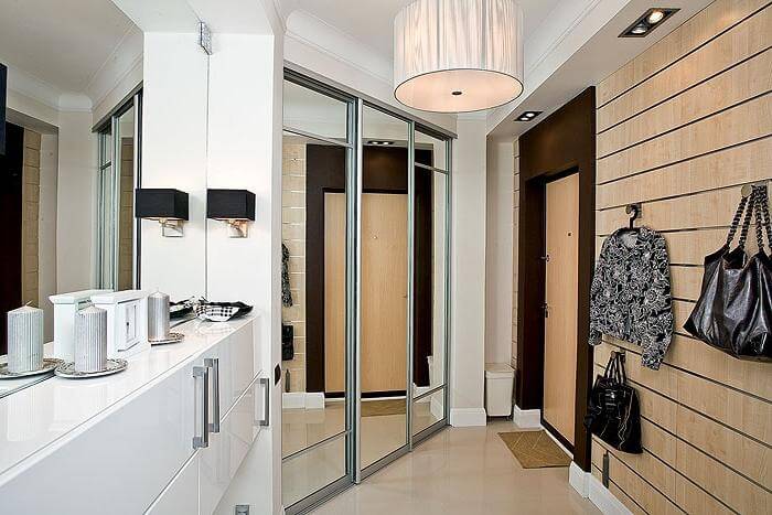 La conception du miroir est plutôt impressionnante à l'intérieur - les panneaux du miroir décorant le tableau sont montés sur les murs. Une telle décision dans la décoration des murs du couloir facilite leur entretien. Les limites des idées ne sont pas ici. Vous pouvez combiner la décoration avec de la peinture et de petites tuiles.