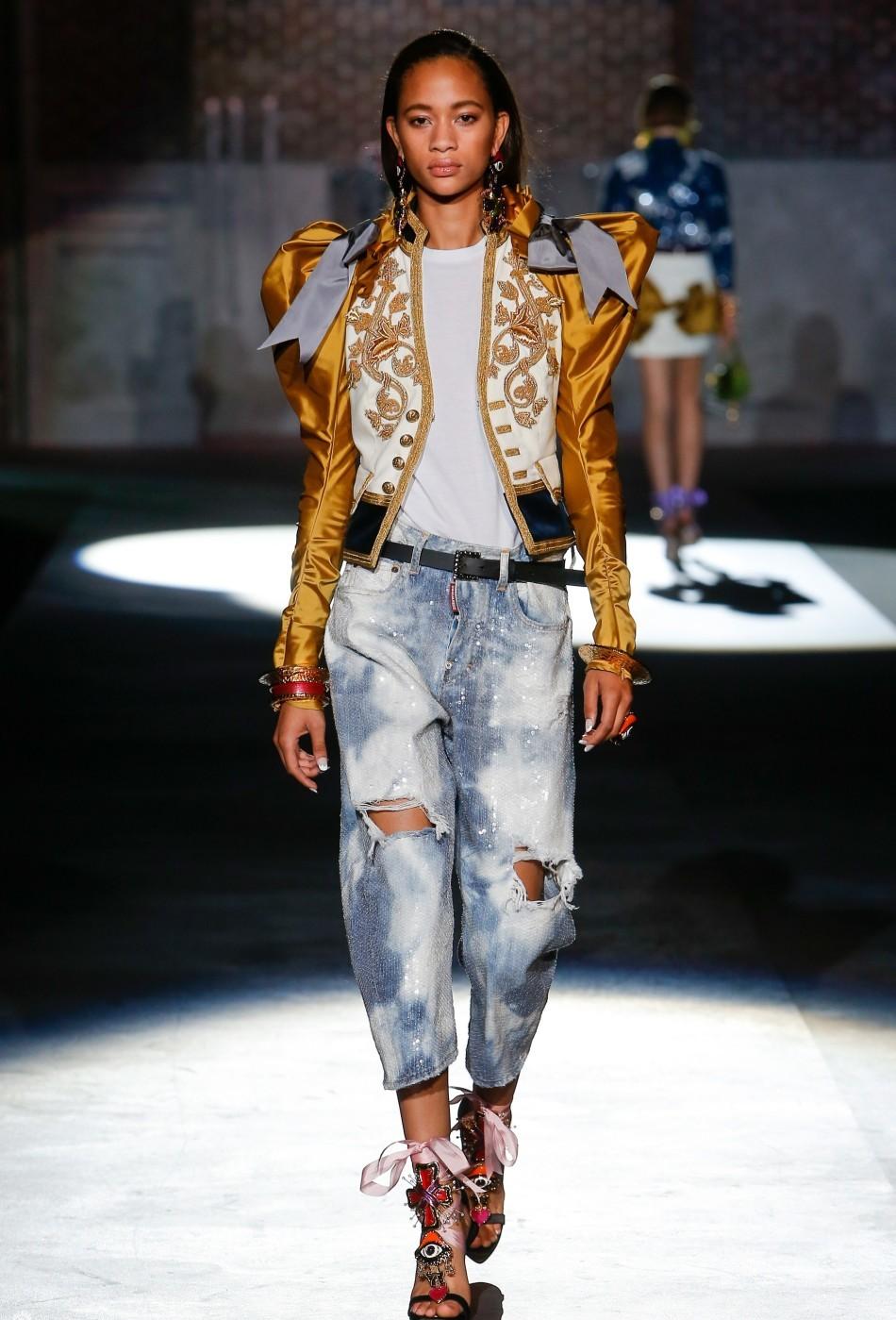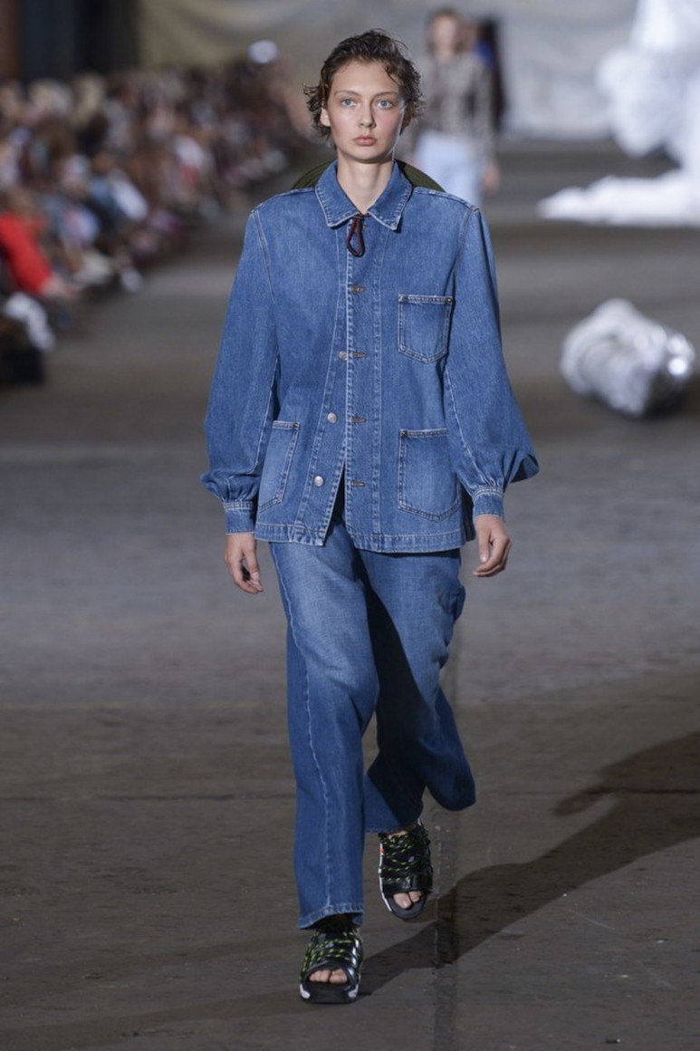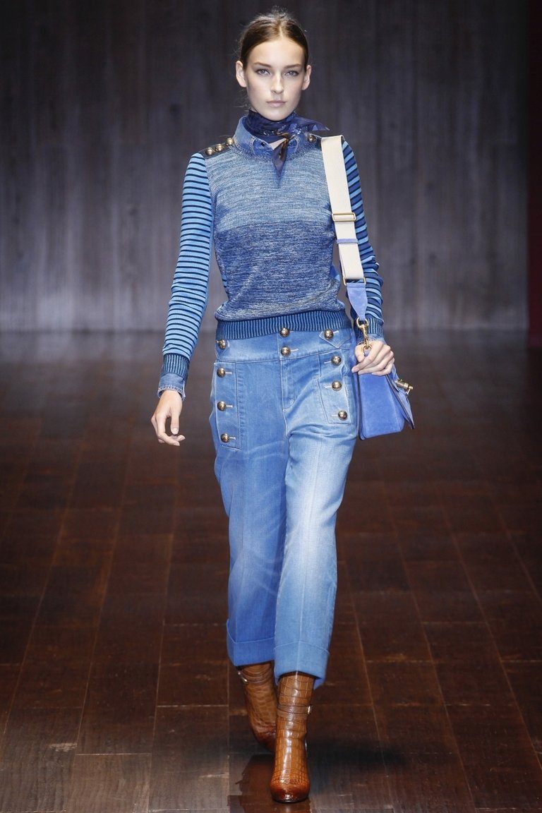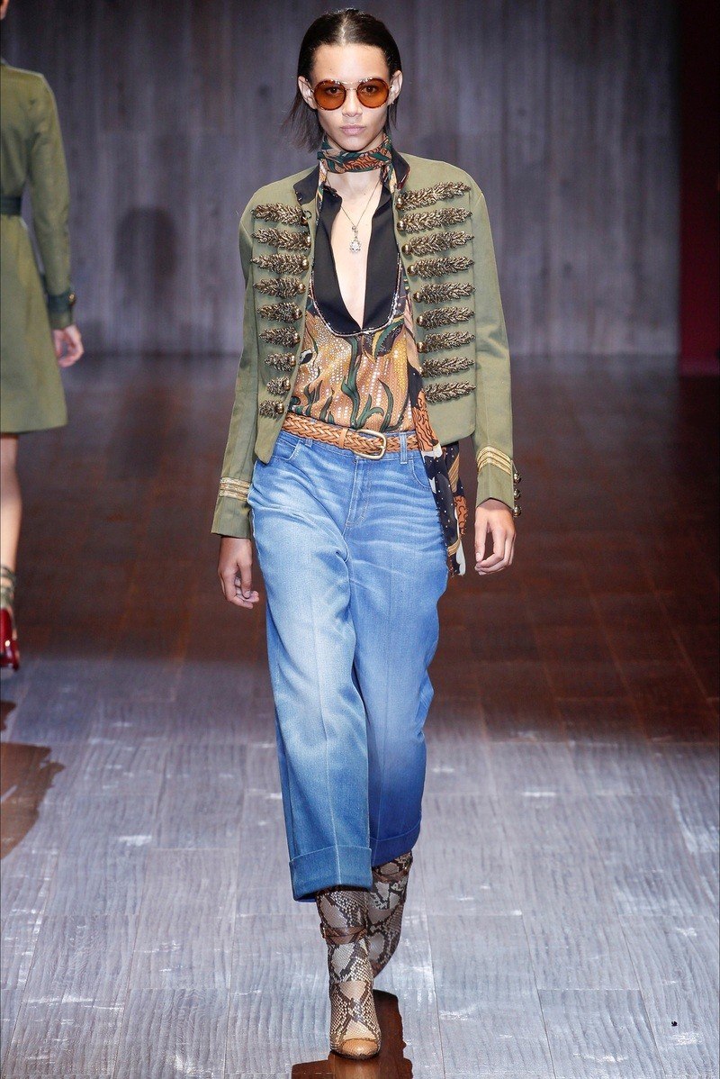 L'armée comprend - kaki, gracieuses nuances de gris, bleu profond, ton sable et imprimé camouflage. Ainsi que la décoration sous la forme d'épaulettes, ordres, emblèmes, insignes, accélérants. Certains modèles sont présentés avec un grand nombre de poches, une coupe droite avec des lignes claires. Les jeans dans le style du minimalisme sont également souvent trouvés. Les éléments de décoration de cette saison sont des boutons de différents matériaux.