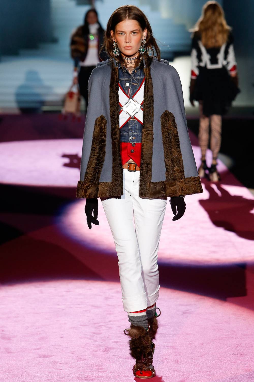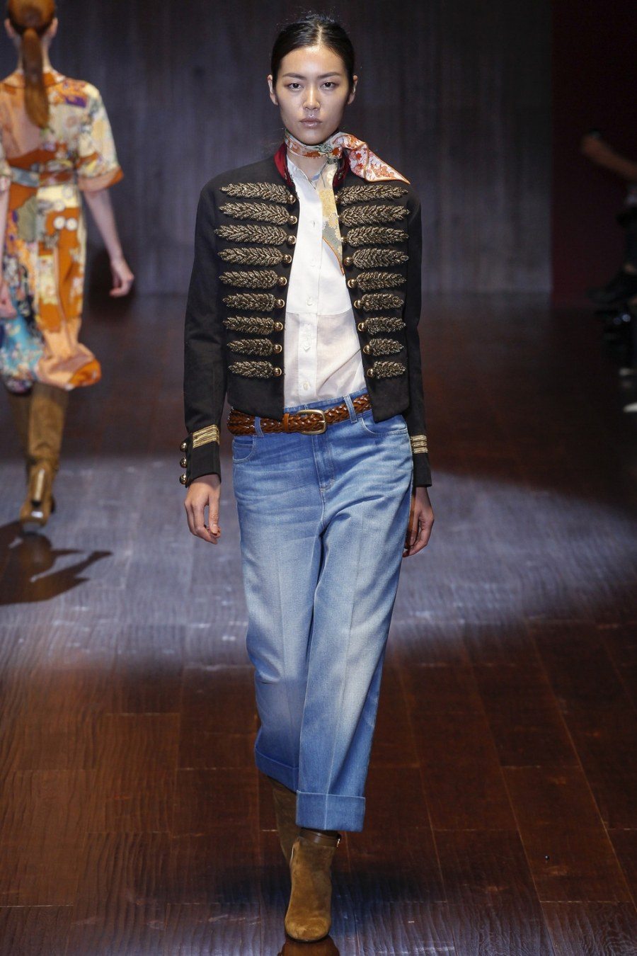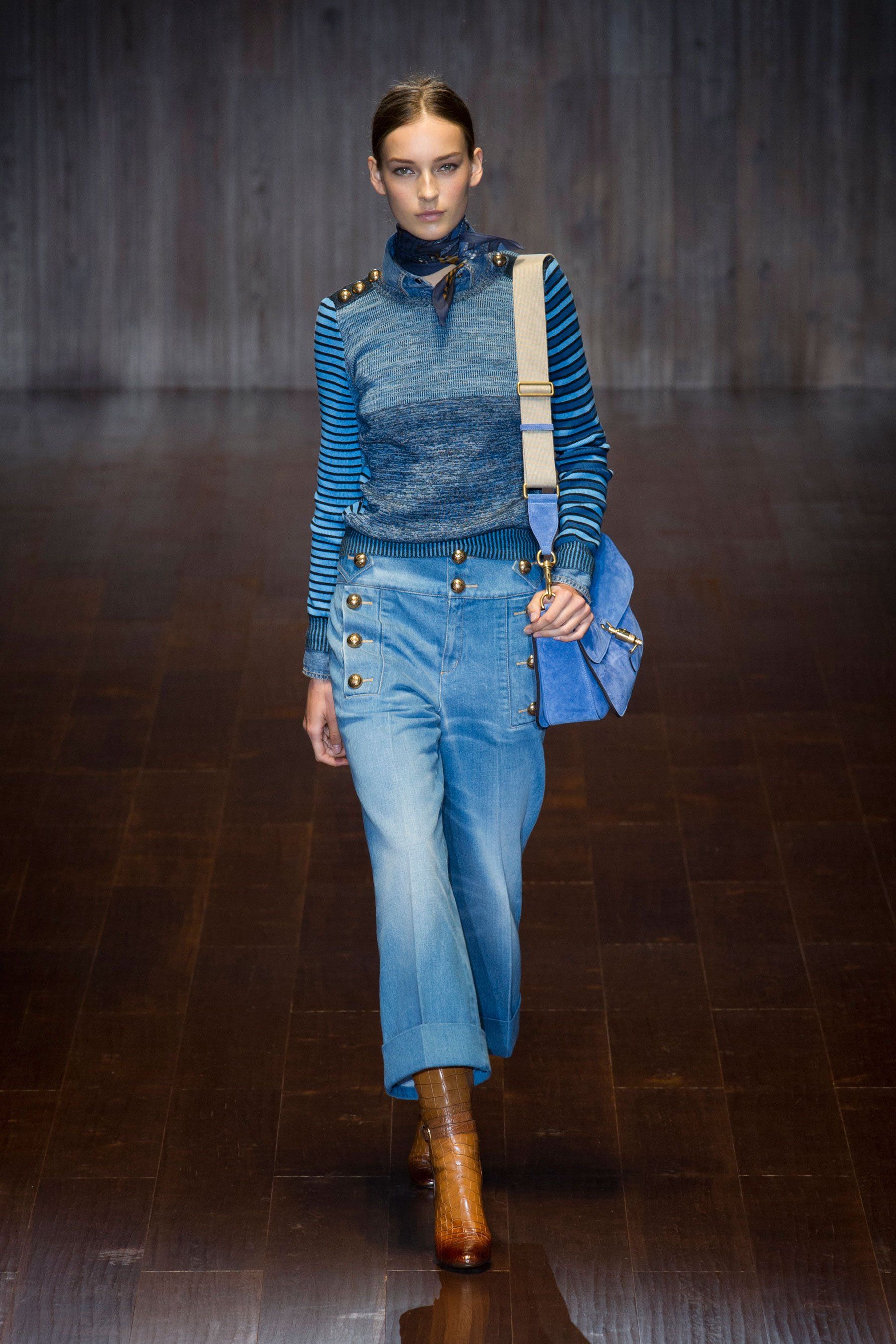 L'armée comprend - kaki, gracieuses nuances de gris, bleu profond, ton sable et imprimé camouflage. Ainsi que la décoration sous la forme d'épaulettes, ordres, emblèmes, insignes, accélérants. Certains modèles sont présentés avec un grand nombre de poches, une coupe droite avec des lignes claires. Les jeans dans le style du minimalisme sont également souvent trouvés. Les éléments de décoration de cette saison sont des boutons de différents matériaux.