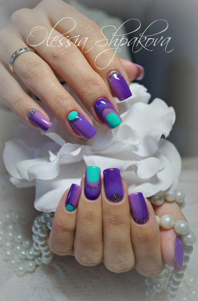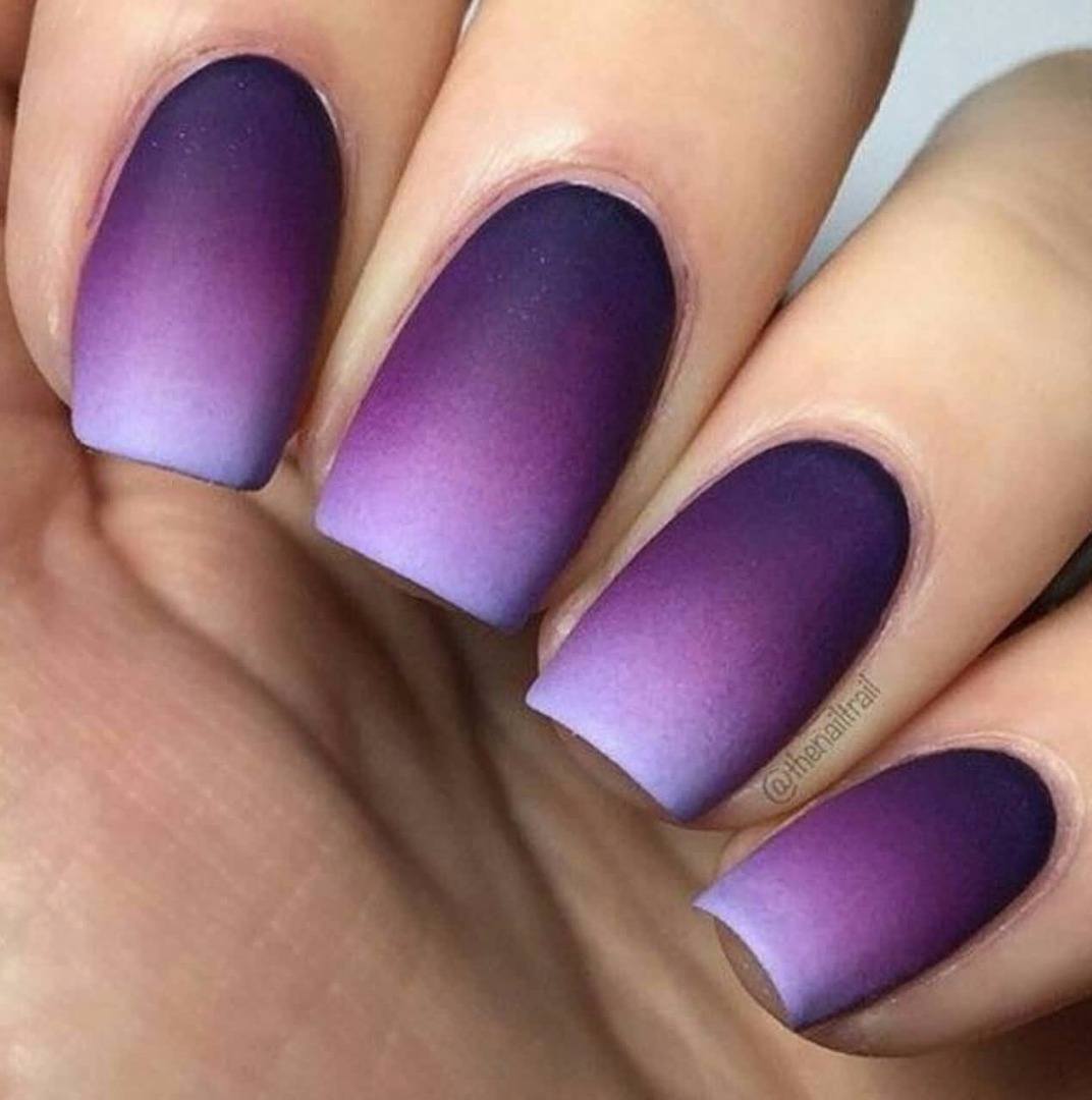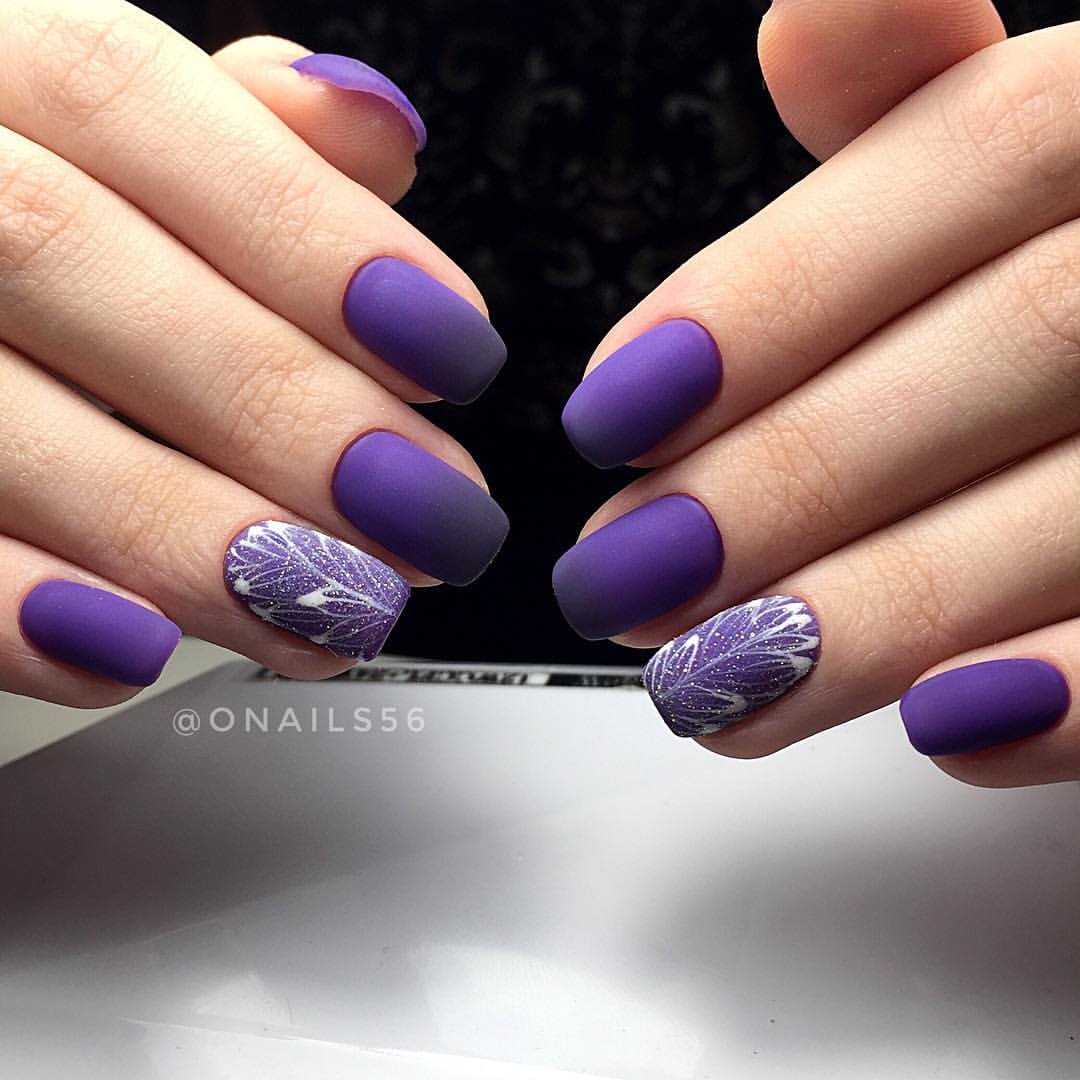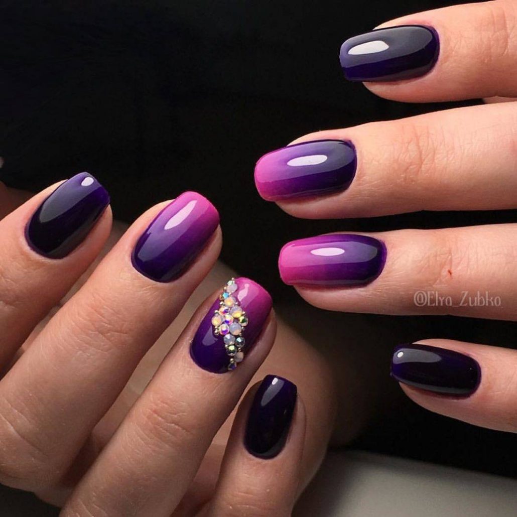 Le violet saturé est idéal pour créer une manucure à gradient. En même temps, il peut être combiné, à la fois avec des tons de couleur similaire et avec des nuances contrastées (noir, blanc, gris, rose, etc.). La transition de couleur peut être horizontale ou verticale.