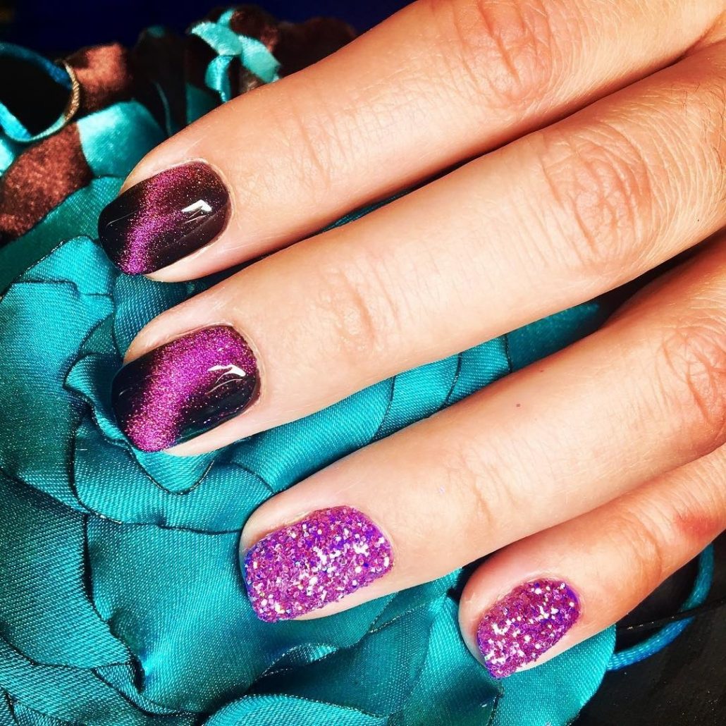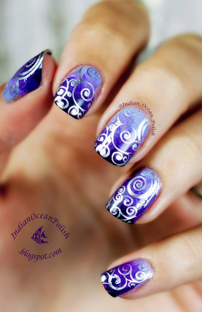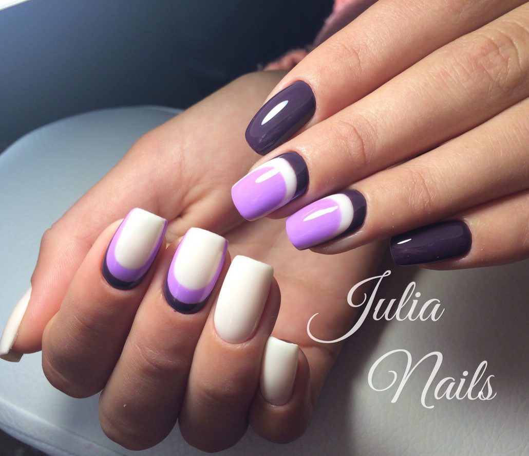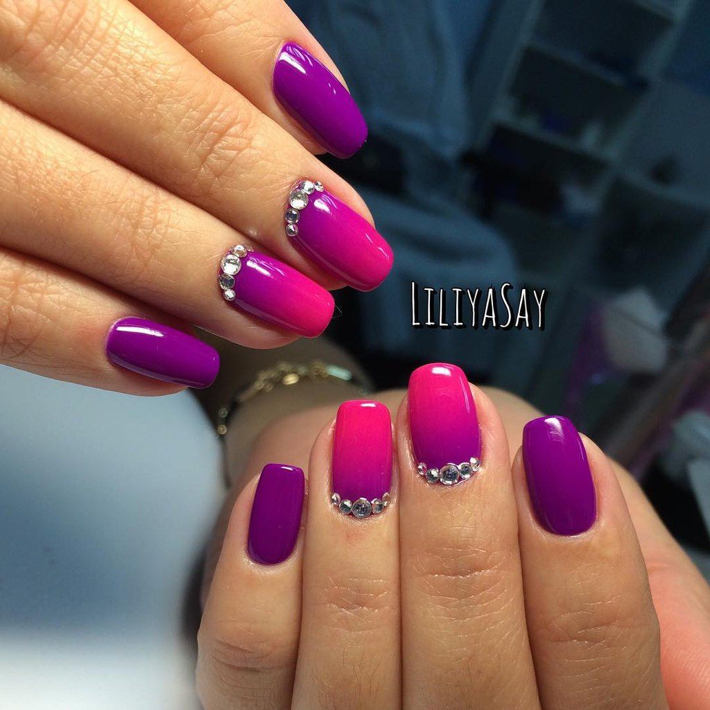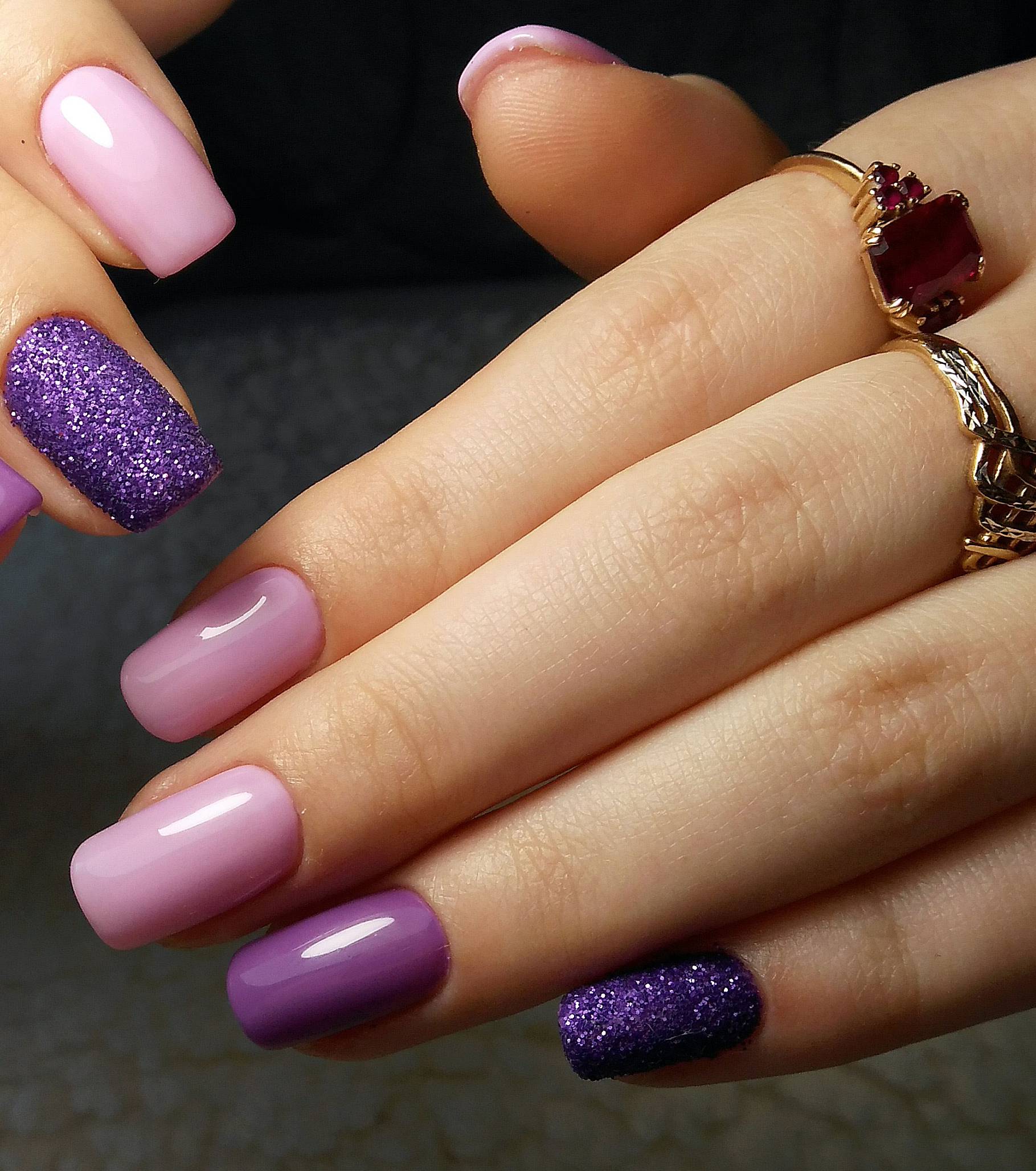 Le violet saturé est idéal pour créer une manucure à gradient. En même temps, il peut être combiné, à la fois avec des tons de couleur similaire et avec des nuances contrastées (noir, blanc, gris, rose, etc.). La transition de couleur peut être horizontale ou verticale.