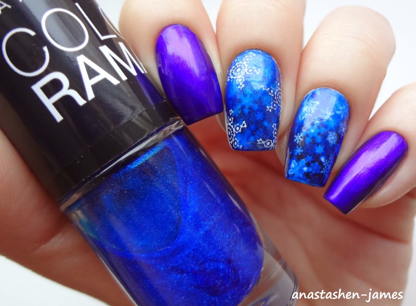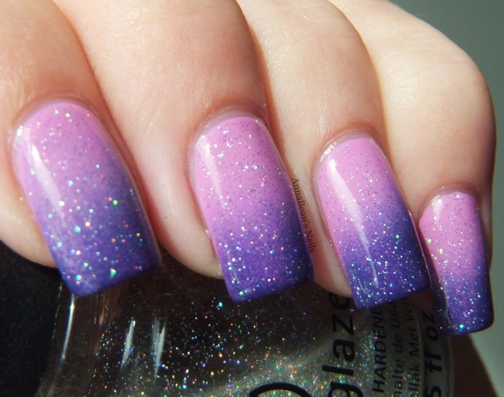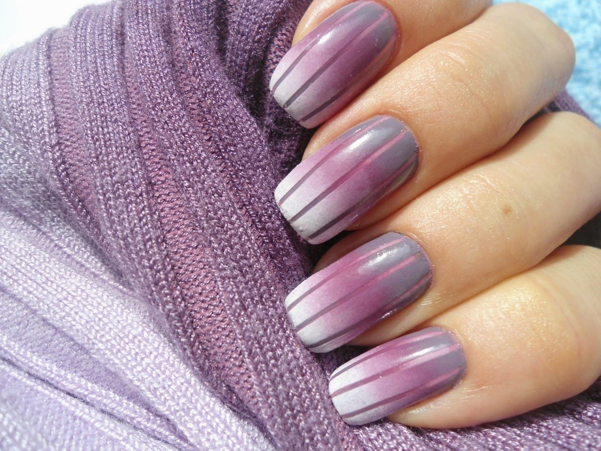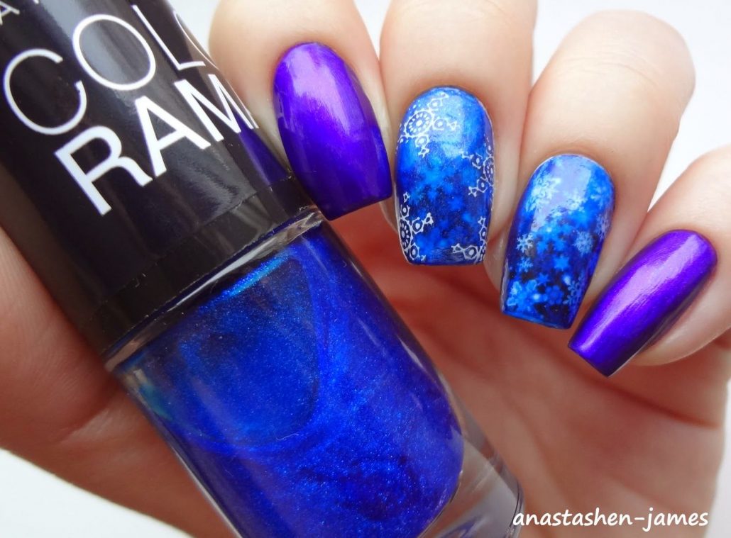 Le violet saturé est idéal pour créer une manucure à gradient. En même temps, il peut être combiné, à la fois avec des tons de couleur similaire et avec des nuances contrastées (noir, blanc, gris, rose, etc.). La transition de couleur peut être horizontale ou verticale.
