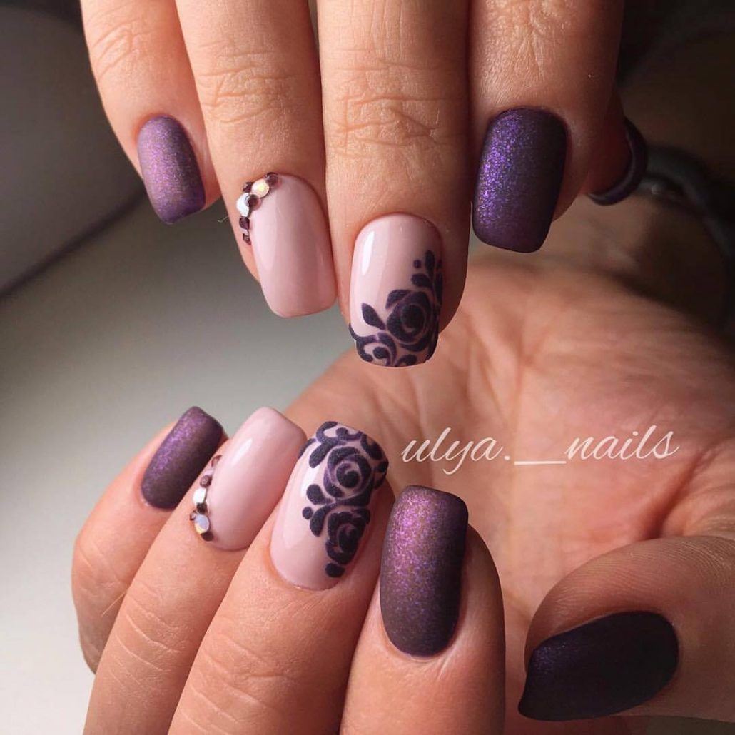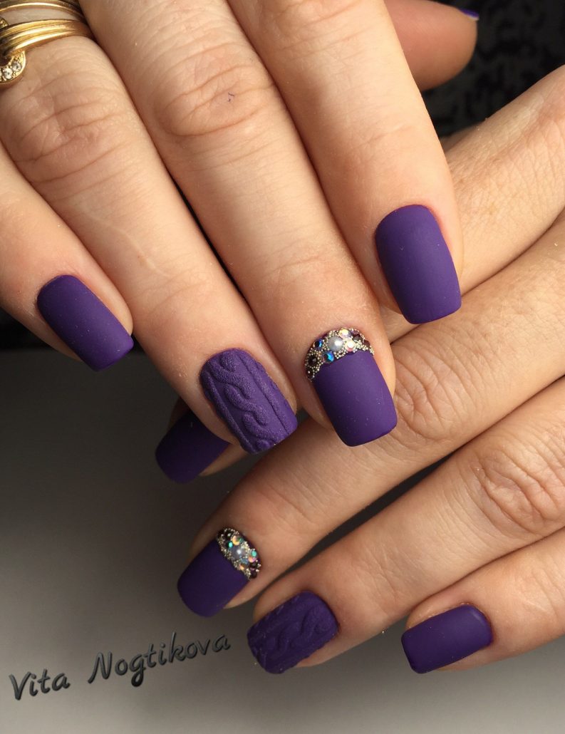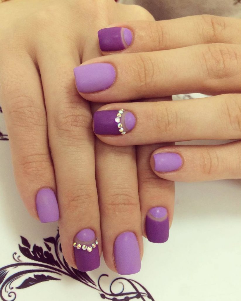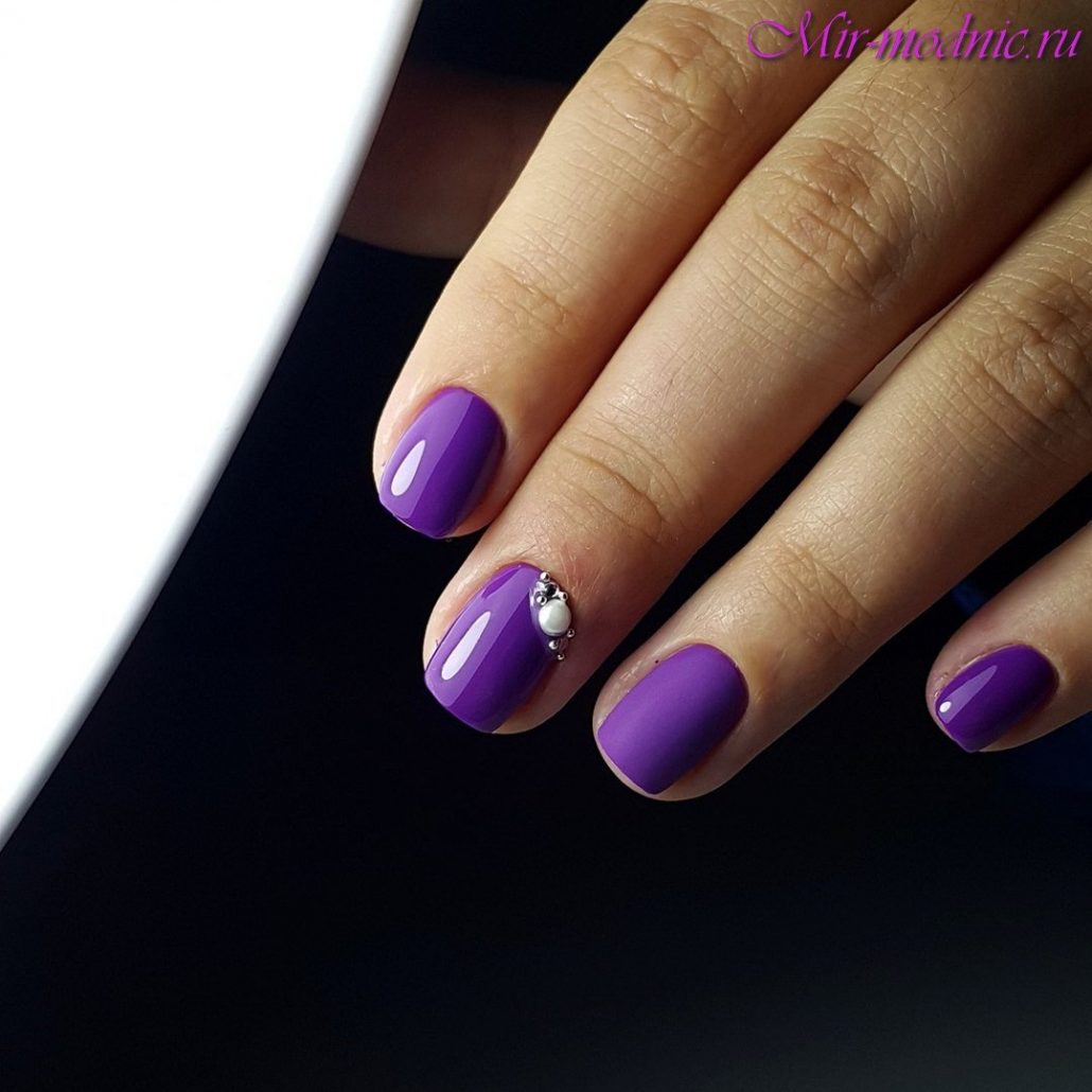 Même dans une version monochrome, la manucure violette aura un aspect élégant, en particulier si elle est mate. Le rubis violet aura l'air glamour. Mais si vous le souhaitez, ses nuances peuvent toujours être combinées avec des couleurs classiques (blanc, noir, gris et beige). Dans une telle variation, il aura toujours l’air attrayant.