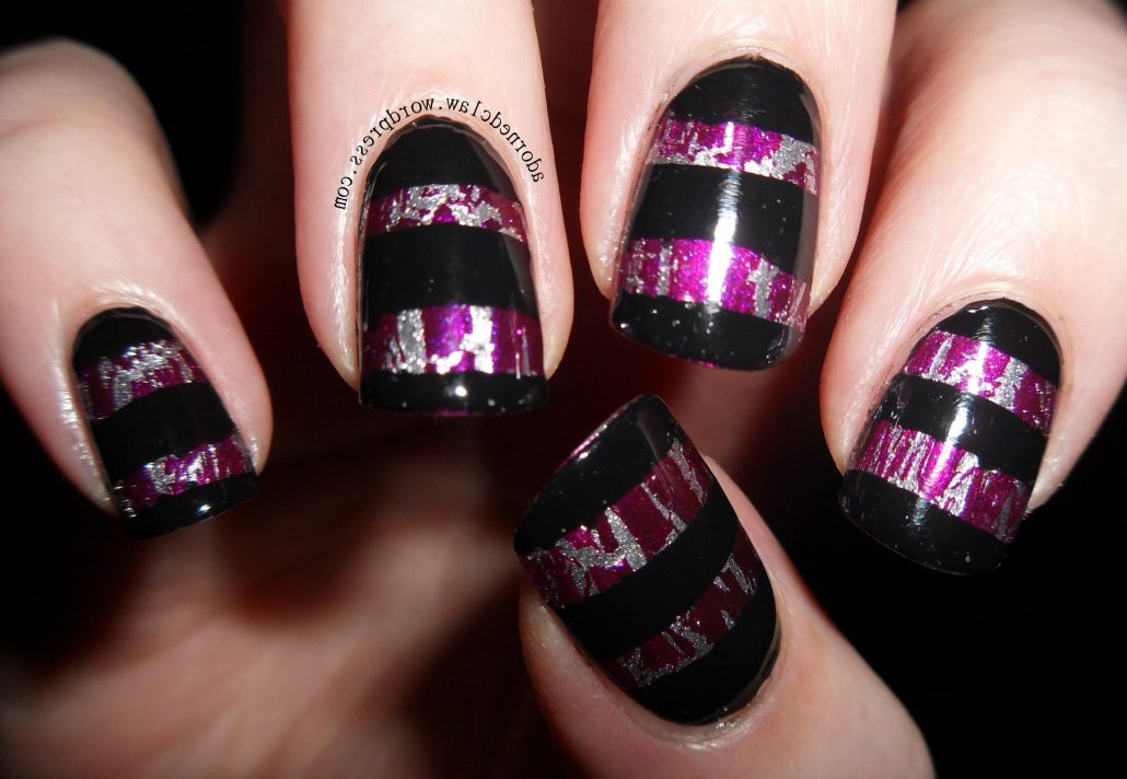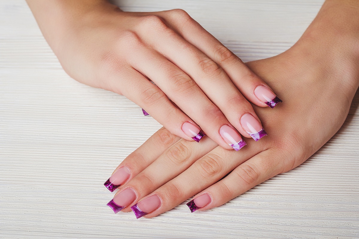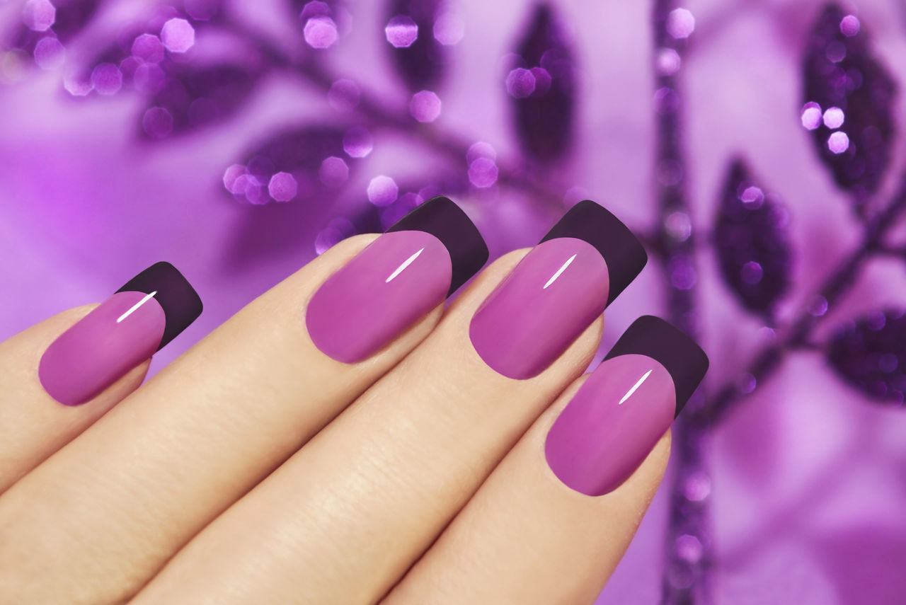 Un autre nom pour cette technique est manucure avec une frange. Rendez-le facile. Pour commencer, le clou est peint avec n'importe quelle nuance de violet, après quoi une frange est appliquée le long du périmètre avec n'importe quelle nuance contrastante. Ensemble avec violet, jaune, noir ou tout autre qui correspond à elle va paraître spectaculaire.