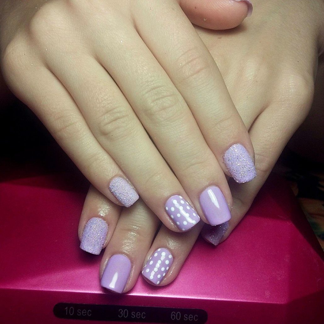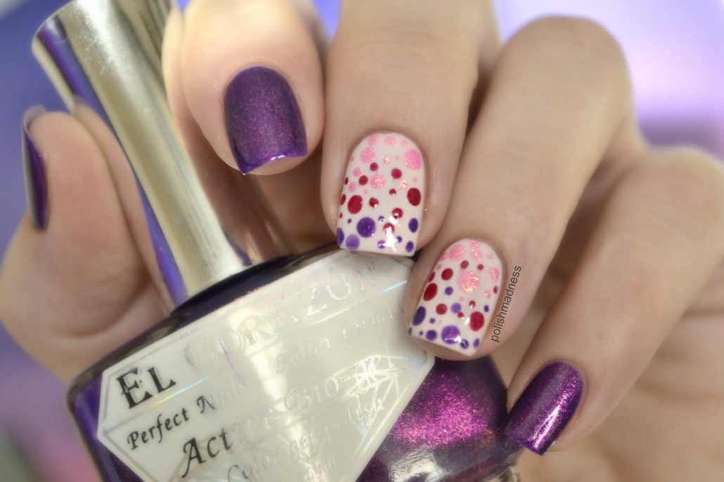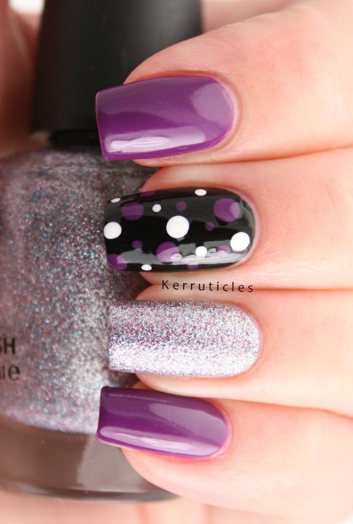 Une base violette décorée de pois multicolores aura l’air très mignon. Pour commencer, l'ongle est peint avec n'importe quelle nuance de violet, après quoi, à l'aide de points ou d'un pochoir, des points de toutes les couleurs et de toutes les tailles sont appliqués sur le dessus.