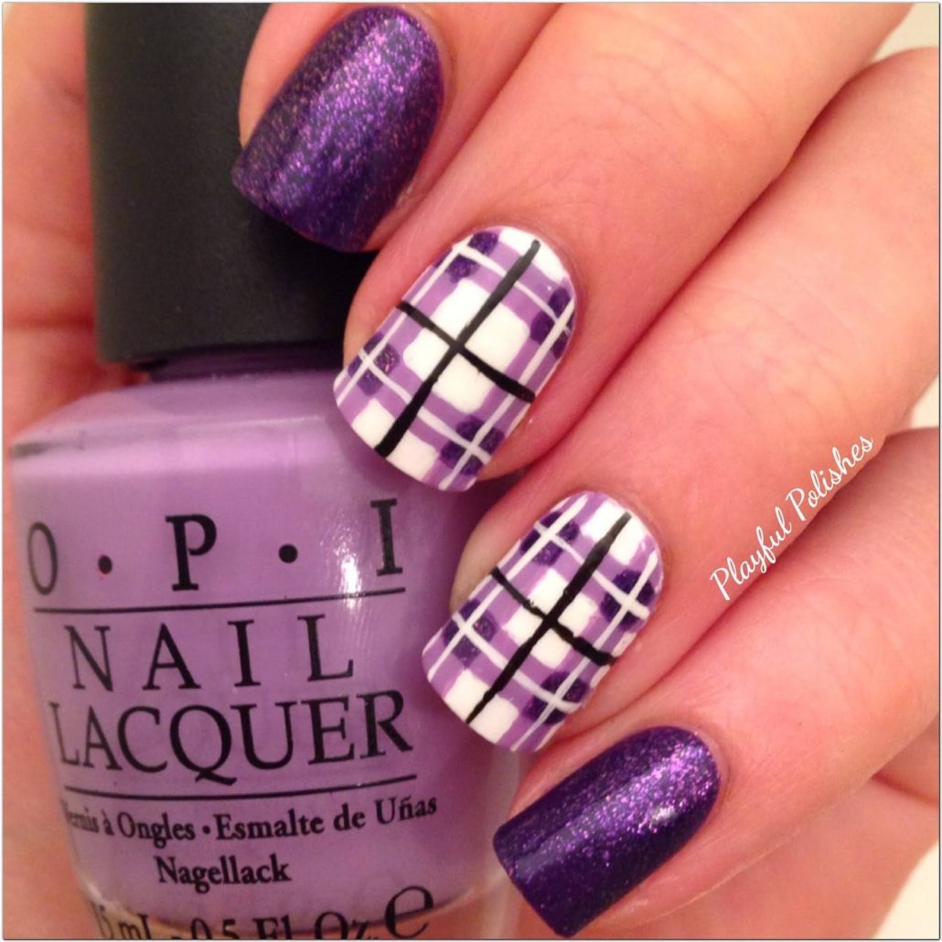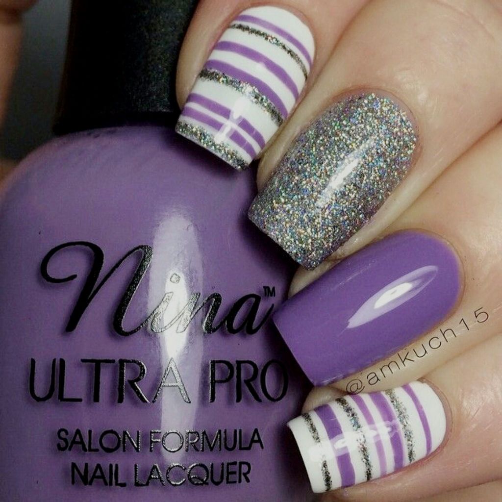 Une manucure en cage ou en patchwork sera très intéressante à regarder en violet. Vous pouvez le dessiner avec un pinceau ou utiliser des pochoirs. De plus, la manucure à carreaux peut être décorée d'étincelles ou de strass.