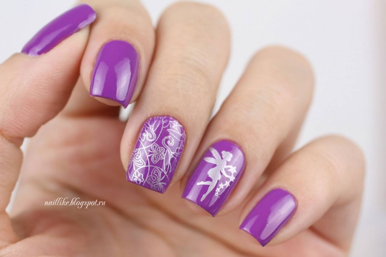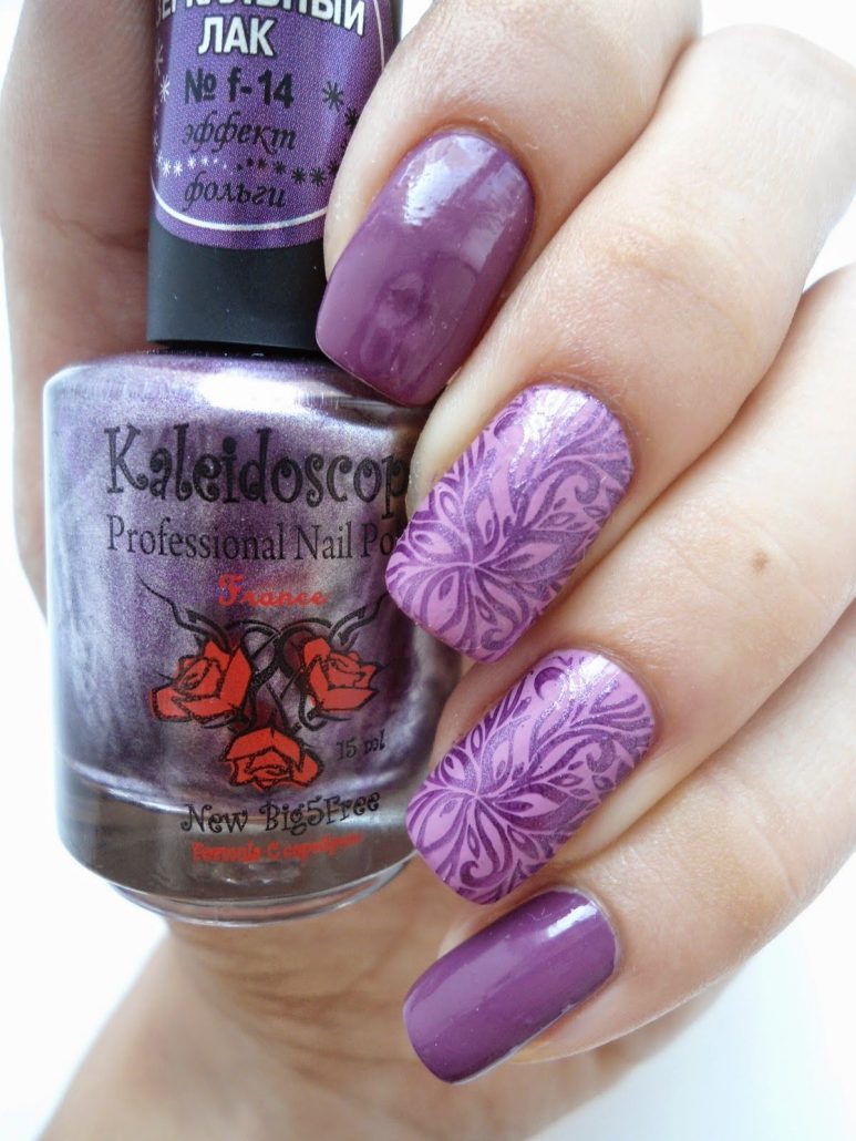 Les amateurs d'ornements floraux peuvent choisir le violet comme base ou dessiner des fleurs sur un fond blanc ou d'un autre fond clair. Bien sûr, une telle manucure ne devrait être approuvée que par un maître professionnel qui peut faire un beau dessin sur l’ongle. Mais si vous êtes déterminé à vous faire une fleur de manucure, vous pouvez utiliser des pochoirs ou des autocollants spéciaux.