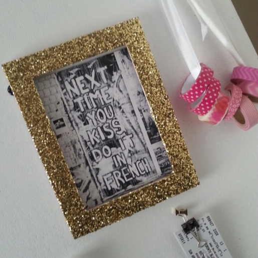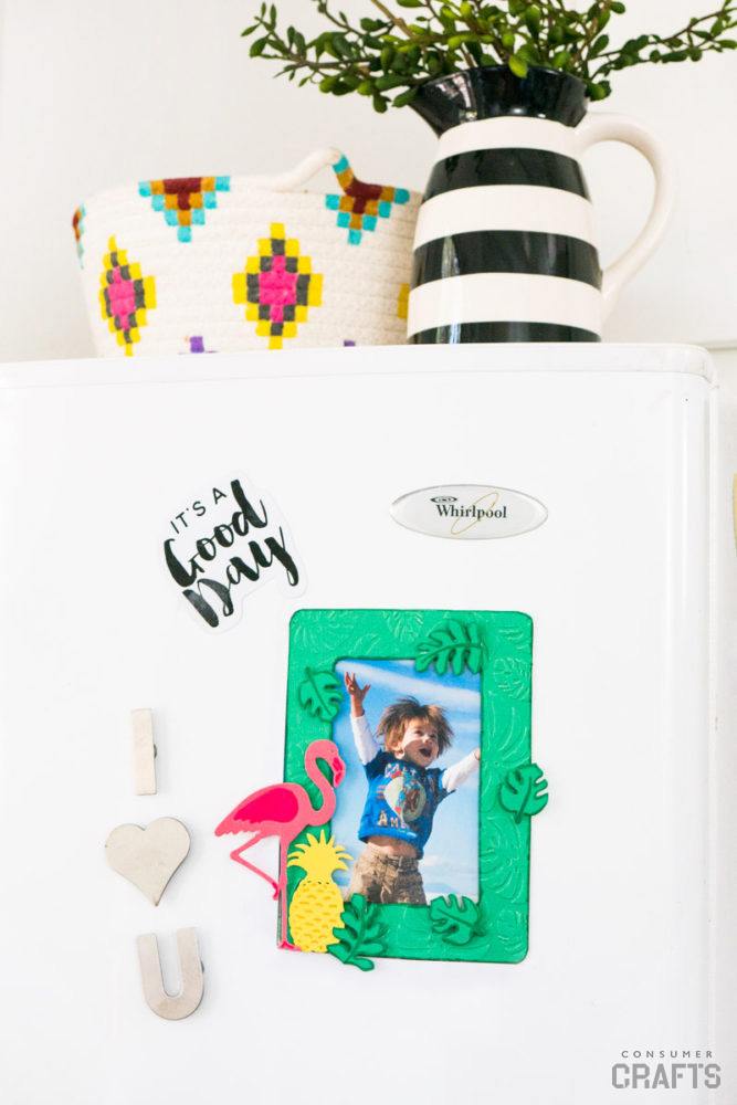 Collez la photo sur le cadre et décorez tout élément intérieur avec un revêtement en métal. Dans ce cas, c'est un réfrigérateur.