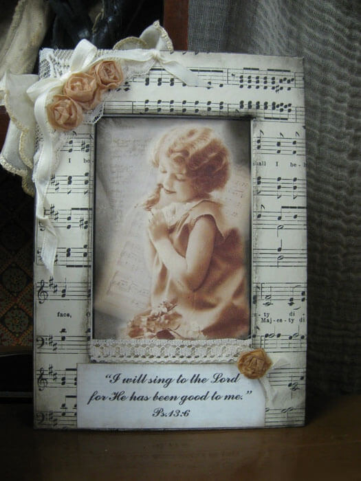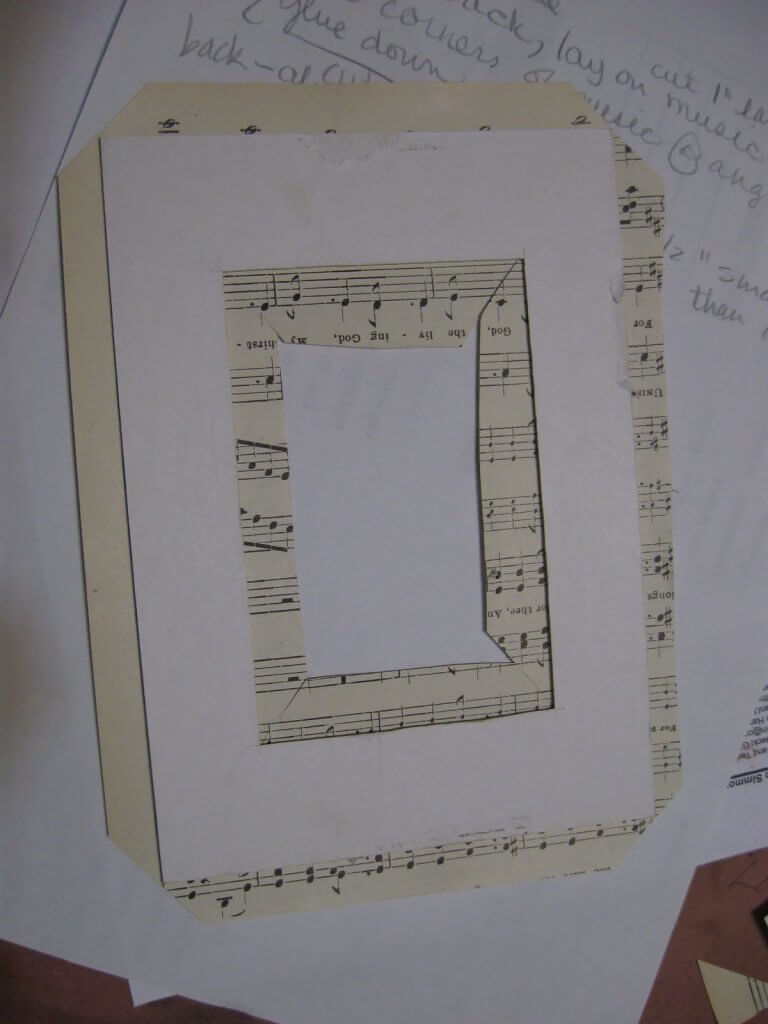 Collez un morceau de carton au dos du cadre. Sur la face avant, collez une serviette avec un motif ou du papier à musique.