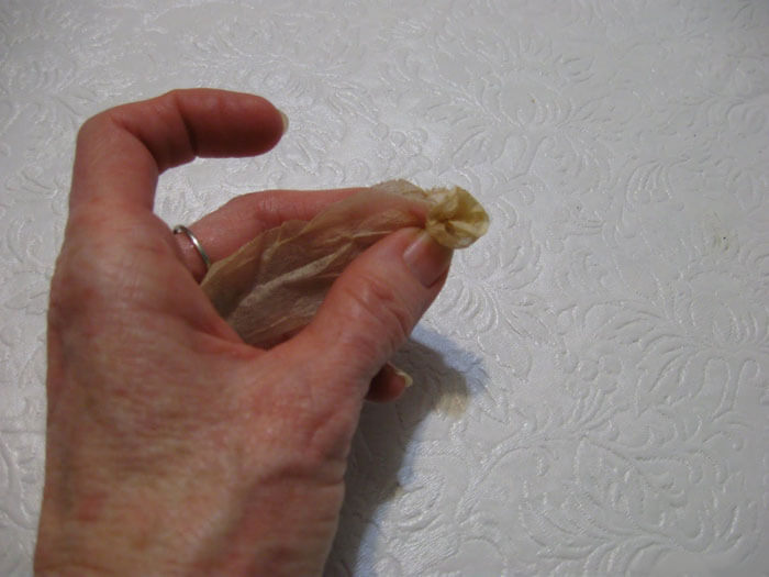 Une fois que tous les blancs sont secs, passez à la création de roses. Nous en prenons un et plions soigneusement le bout.