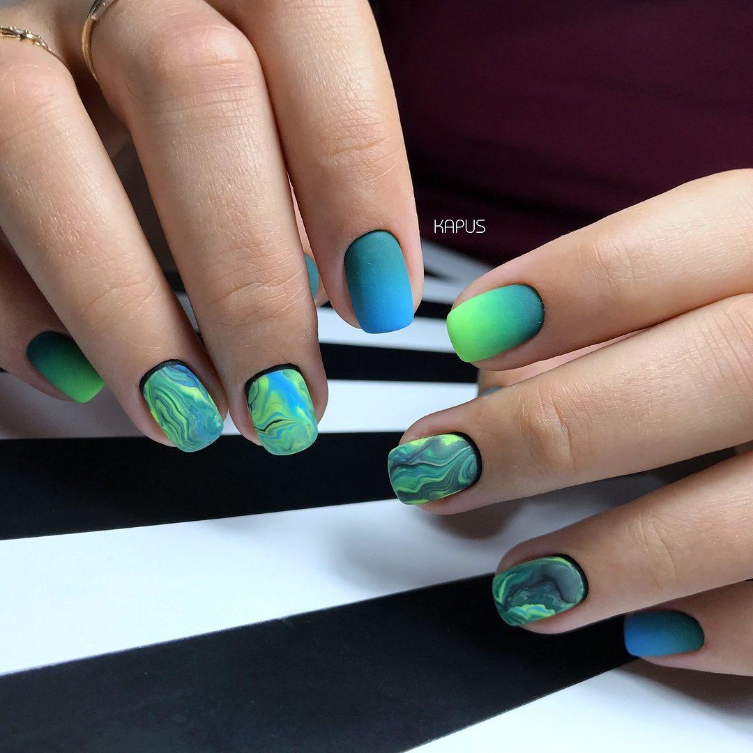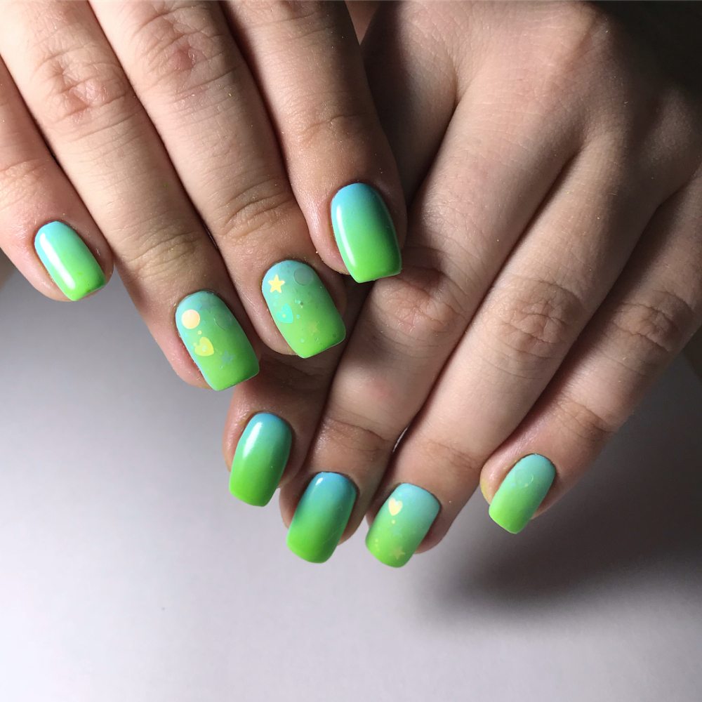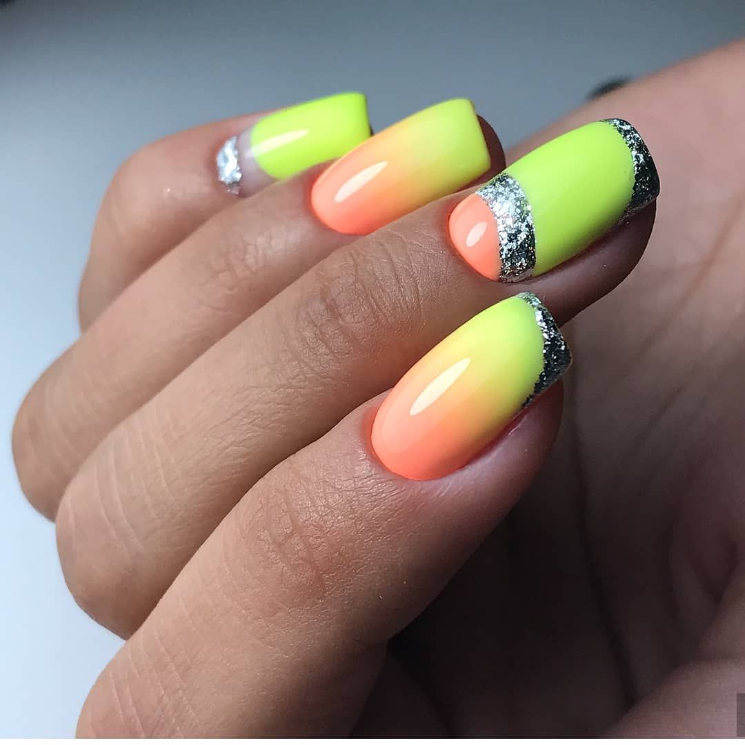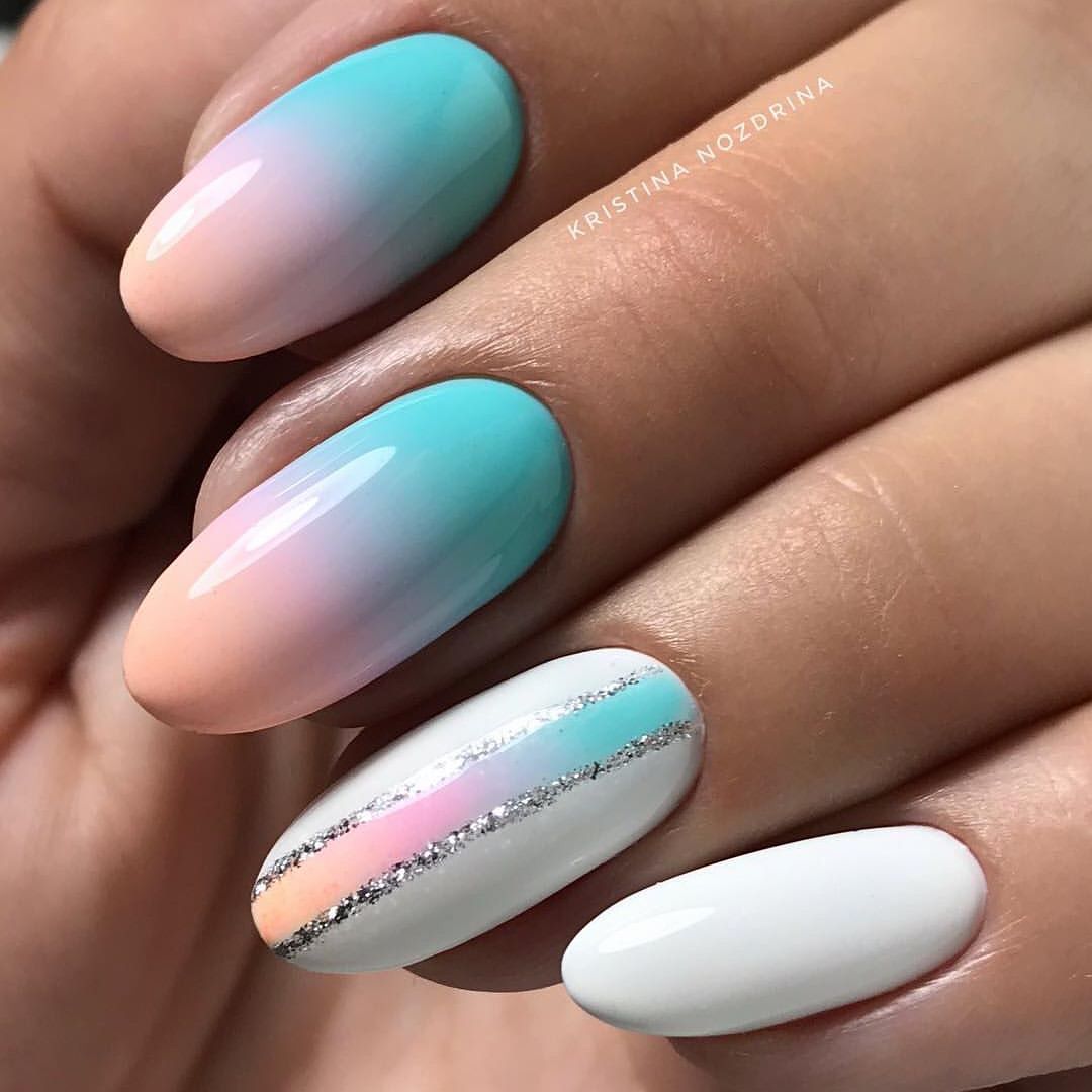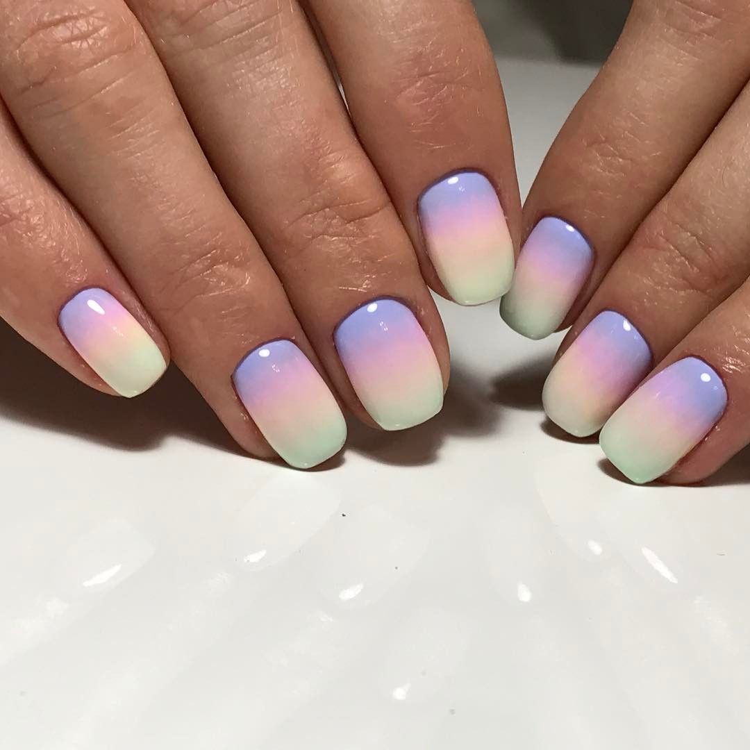 L’idée même de manucure dans le style ombré exprime le sens de la combinaison correcte du schéma de couleurs du revêtement de vernis. Les transitions douces des nuances peuvent transformer les ongles féminins en une véritable œuvre d'art. Malgré tout, les maîtres de manucure utilisent dans certains cas plusieurs nuances de couleur, en les appliquant avec des lignes simples et rugueuses. C'est-à-dire qu'elles privent la manucure féminine de transitions en douceur. Ce type de décoration des doigts féminins a fière allure sur une longue plaque d’ongle. Les ongles courts doivent être décorés avec une veste française ombrée dans des tons calmes et légers. Les représentants de la belle moitié de l’humanité qui ont des ongles assez longs peuvent décorer leur manucure avec des combinaisons de plusieurs couleurs vives. Par exemple, les tons bleu, vert et orange. Ce style de débordement de nuances pourra donner de l'originalité et de l'originalité à l'image de la femme. Il sera également en mesure de montrer au monde extérieur que la jeune fille est assez confiante et prête à des actes extraordinaires. Des transitions de tons brillants de vernis peuvent être utilisées pour des vacances à la plage.
