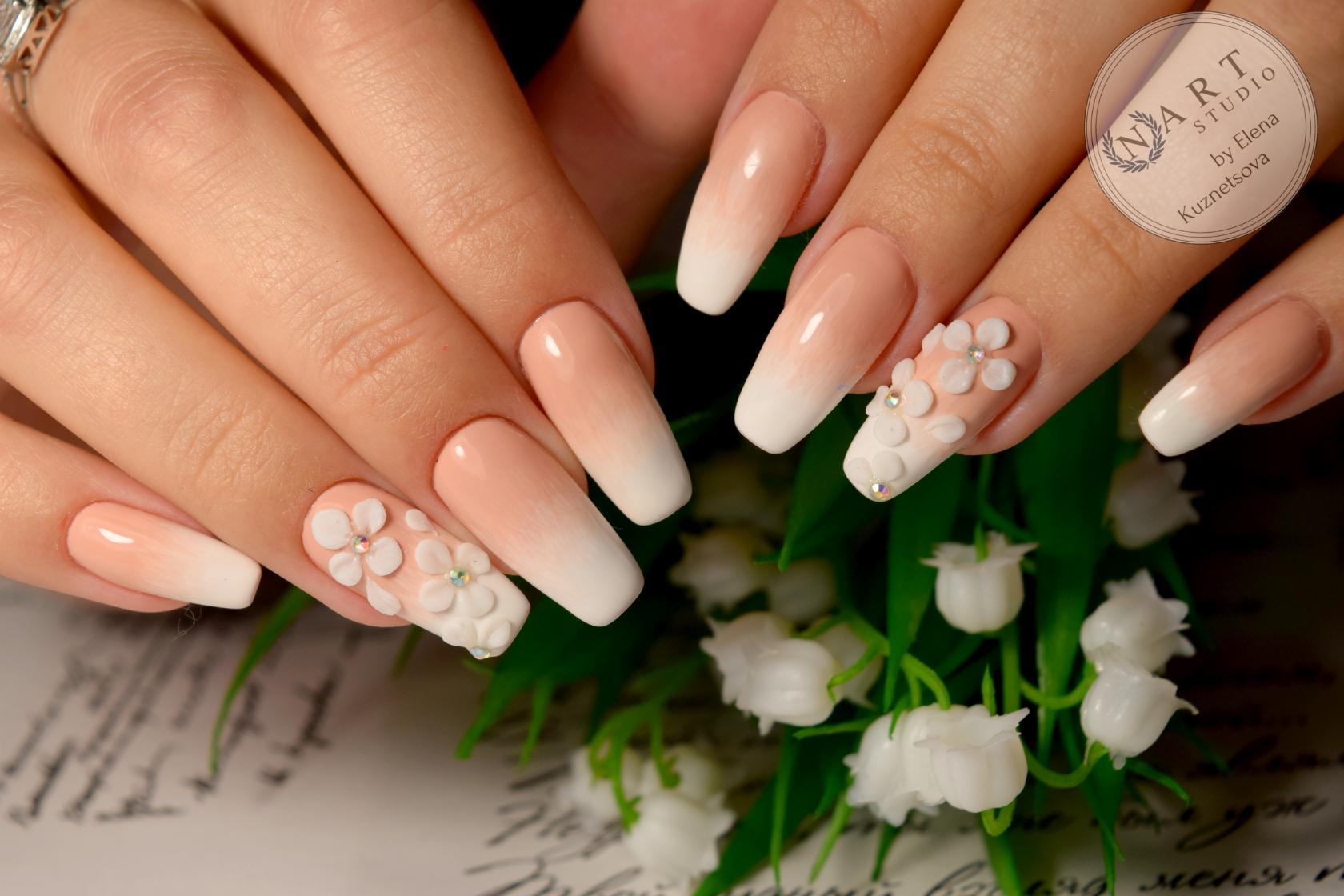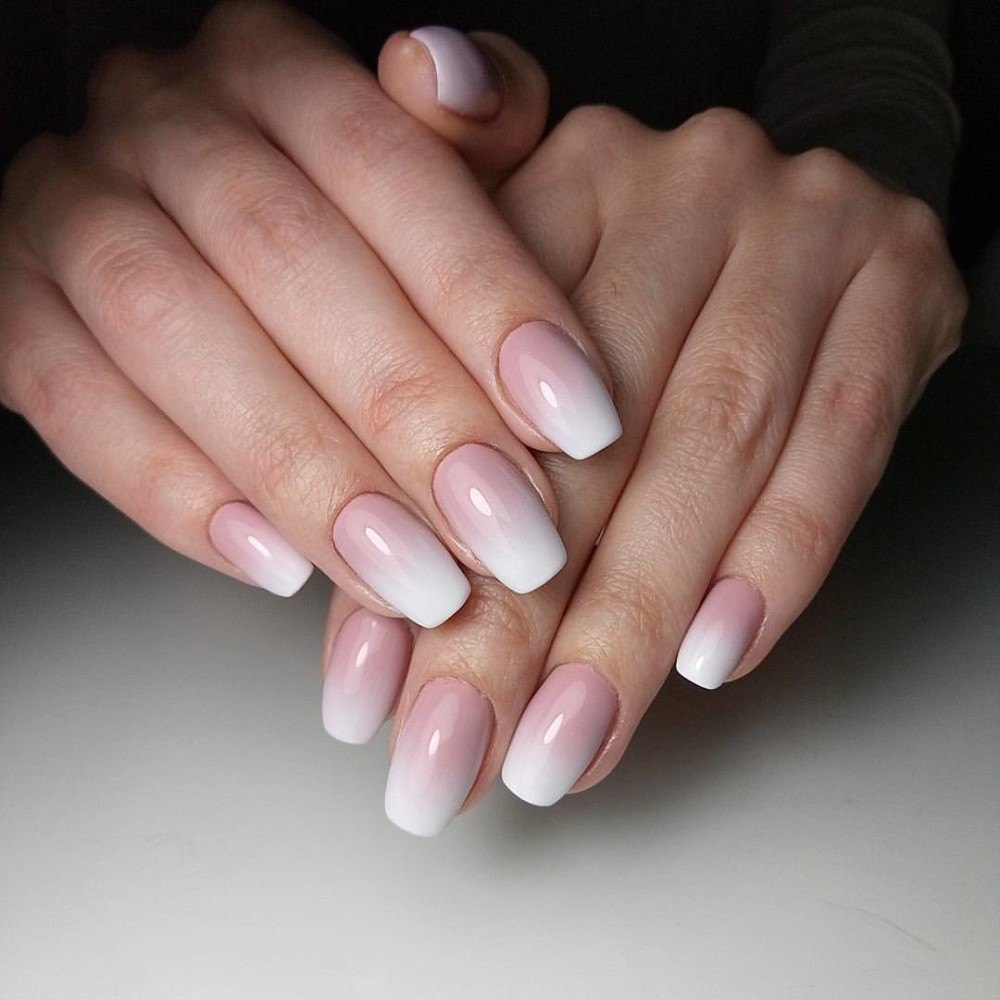 Pour effectuer ce type de manucure, de nombreux appareils ne seront pas nécessaires. Dans l’ensemble, il faut des vernis aux teintes souhaitées, une base, une éponge en caoutchouc mousse ou une brosse spéciale. Ombre est souvent composé de deux, voire de trois couleurs. La chose la plus importante est que les nuances soient combinées les unes aux autres, sinon l'idée du maître peut être gâchée. Pour une version plus simplifiée, vous aurez besoin d'un blanc et d'un ton de lit du revêtement de vernis. Le ton du lit mettra l'accent sur le sourire de la veste. Tout d'abord, la plaque à ongles doit être recouverte d'une base et séchée dans une lampe à ultraviolets. Appliquez ensuite le fond principal de la manucure. Après cela, il vaut la peine de commencer à appliquer la deuxième teinte. Cela nécessitera une éponge en mousse. La principale chose à considérer est que la mousse doit avoir une structure dense. Appliquez donc une couche grasse de la nuance souhaitée sur l’éponge et tamponnez l’ongle avec du vernis par légers mouvements. Dans la zone de transition des nuances, il vaut la peine d'appliquer une éponge aussi faiblement que possible. Cela donnera de la douceur dans les transitions des nuances.