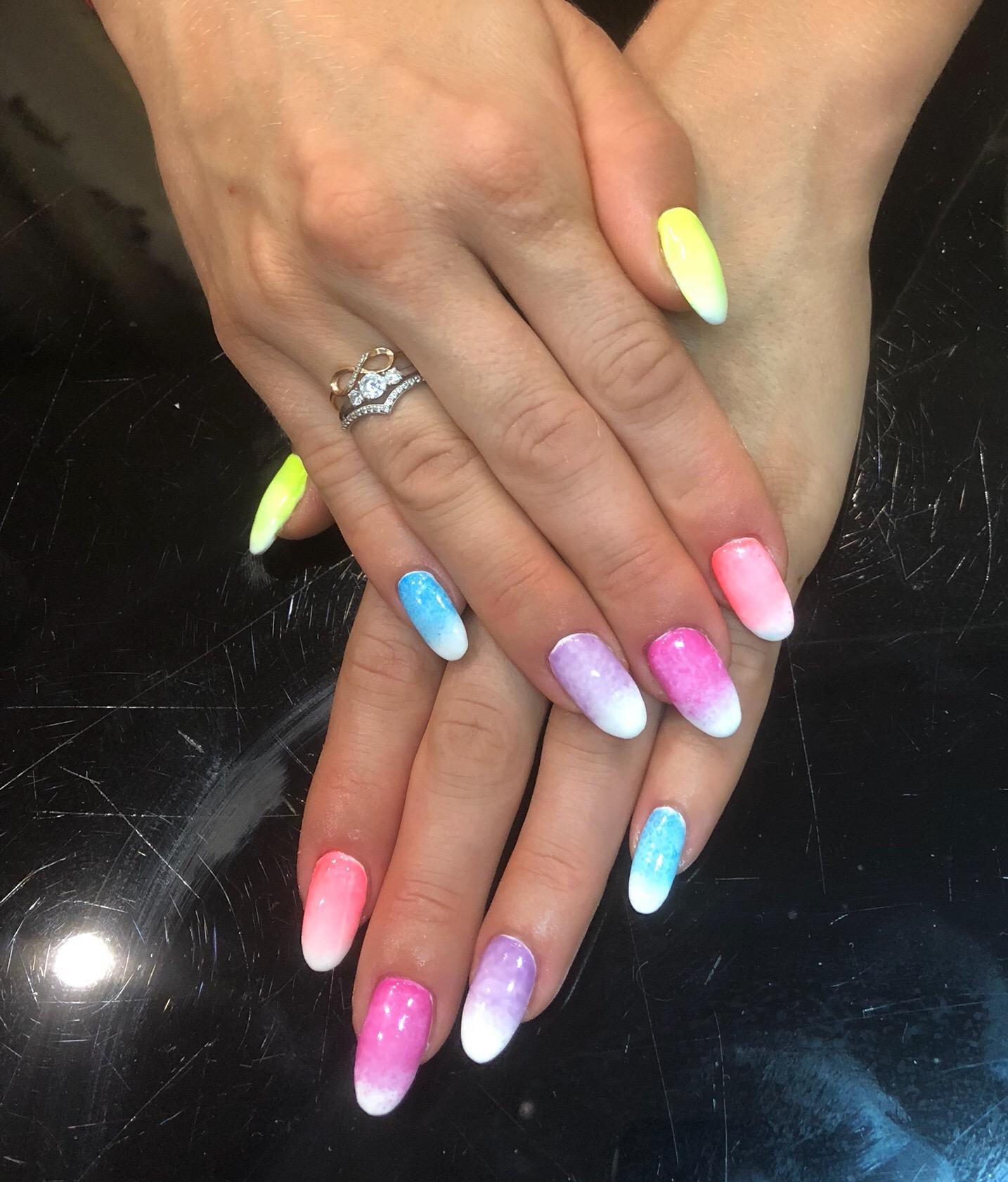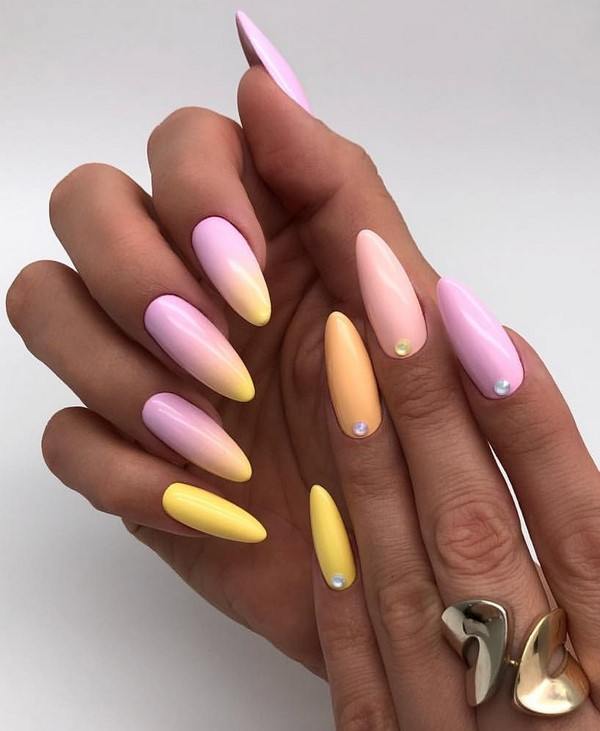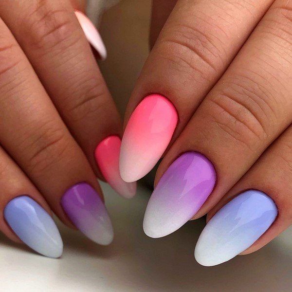 Il existe un autre moyen incroyable de confectionner une veste de style ombré. Pour cette manucure, vous devez disposer d'un fond, d'une éponge en mousse, d'une palette, d'un pochoir pour effectuer un vernis français et, bien sûr, des vernis nécessaires. Les nuances dépendent du choix de la future hôtesse de manucure. Comme chacun le sait déjà, la première chose à faire est de poser une base sur le clou. La prochaine étape consistera à fixer le pochoir pour une exécution ultérieure de la veste. Pour la transition souhaitée des nuances qui ont été planifiées, il convient d'essayer d'abord sur la palette. Vous pouvez également utiliser des cure-dents réguliers pour mélanger les tons. Si le maître a déjà «rempli la main», cette procédure lui semblera superflue. Le spécialiste commencera immédiatement à appliquer les revêtements de vernis immédiatement sur l'éponge. Pour transférer les couleurs, l'éponge doit être placée verticalement sur l'ongle. Pour que la manucure ait une couleur vive et riche, il est utile de répéter l'opération plusieurs fois. À la fin du travail, le pochoir est retiré à l'aide d'une pince à épiler. À la fin, les ongles doivent être recouverts d'un sommet. Pour les femmes qui aiment expérimenter leur image, chaque ongle peut avoir une combinaison différente de nuances de couleurs.