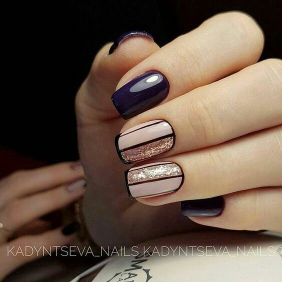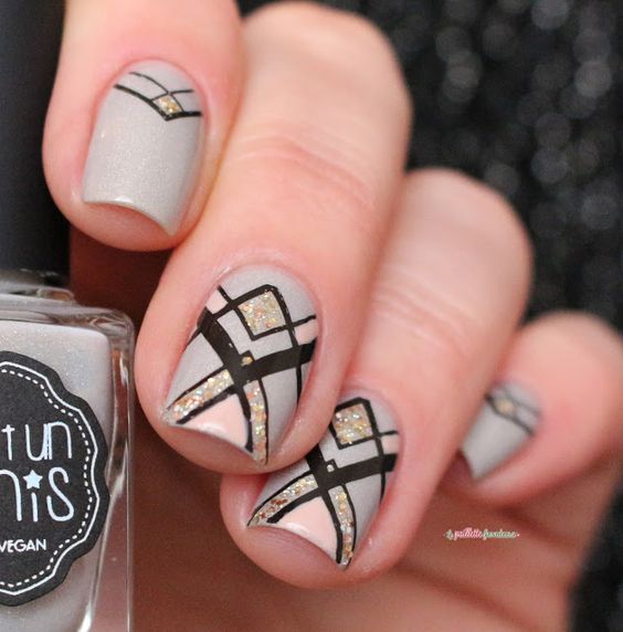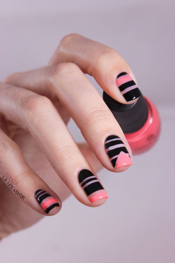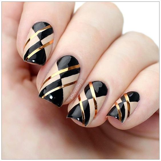 Les maîtres de manucure débutants devraient essayer de commencer avec des formes géométriques simples - lignes droites et segments, et après avoir maîtrisé des techniques de manucure géométrique plus complexes. La façon la plus simple de créer des lignes géométriques consiste à utiliser une brosse fine pour la manucure. Pourquoi est-ce mince? Oui, car la précision et la régularité des traits d'une manucure géométrique dépendent de l'épaisseur de la brosse. Vous pouvez utiliser des outils improvisés, tels qu'un cure-dent. En général, de nombreux accessoires de manucure facilitent la création de motifs géométriques: bandes métalliques, estampage, pochoirs, ruban adhésif, etc. En remplissant votre main avec un pinceau sur les rayures, vous pouvez créer des chefs-d’œuvre géométriques entiers. Évaluez à quel point une manucure géométrique avec des rayures peut sembler frappante. Des rayures parfaitement parallèles ou parallèles vous permettent de créer des chefs-d’œuvre de l’art des ongles.