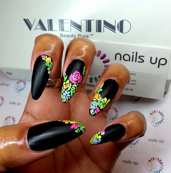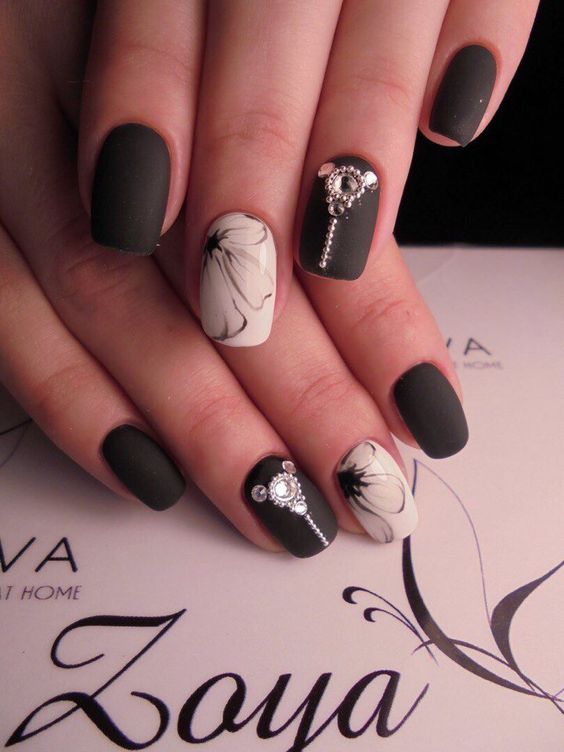 La manucure noire est au sommet de la popularité aujourd'hui, bien que la plupart des femmes la considèrent comme une option quotidienne provocante et inappropriée. Le design des ongles noirs donne à la femme de l'austérité, de la grâce et de la sexualité. Une manucure noire avec une peinture exquise confère aux mains féminines un aspect soigné et magnifique. Une impression florale sur fond noir est incroyablement séduisante. Quoi qu'il en soit, l'ornement floral est l'ornement le plus en vogue de 2026, vous ne devez donc pas éviter les motifs floraux étranges sur un revêtement noir d'ongles.