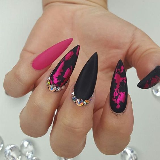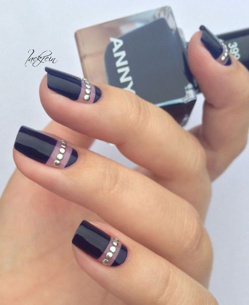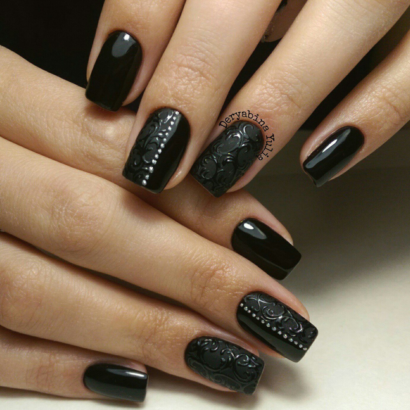 Pour les représentants de la belle moitié de l’humanité qui en ont marre du revêtement classique de vernis noir monophonique, les stylistes suggèrent de changer la forme de l’ongle ou de choisir le noir avec une teinte bleue, bordeaux ou verte. Et encore plus spectaculaire, une telle manucure se penchera sur les pierres et les strass. Avec une telle manucure, il n’est pas du tout gênant de sortir. 100% des autres se feront un plaisir de regarder les mains avec une manucure noire.