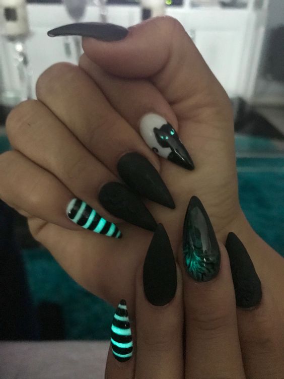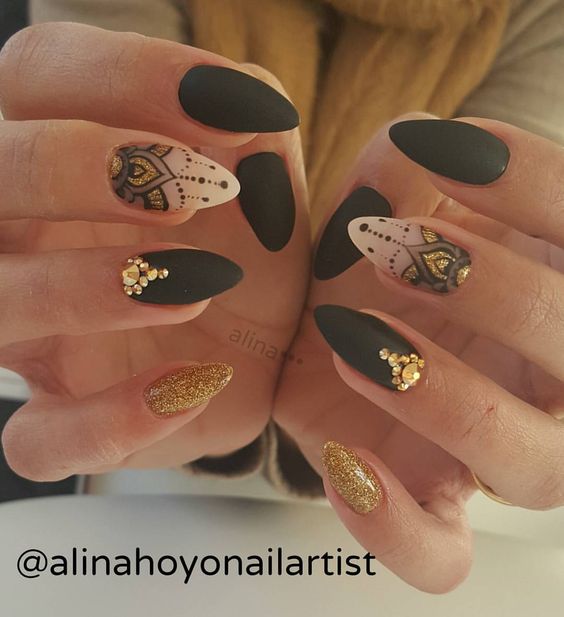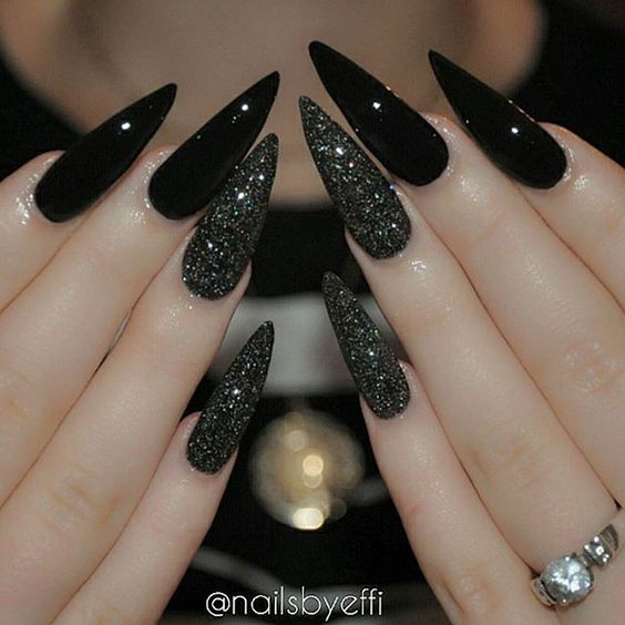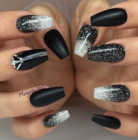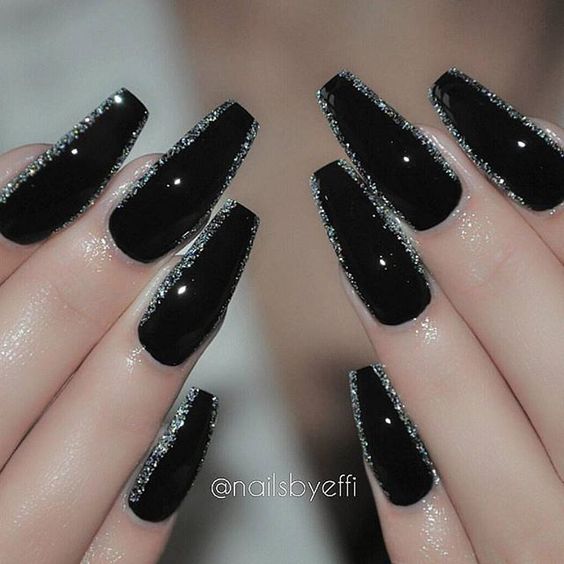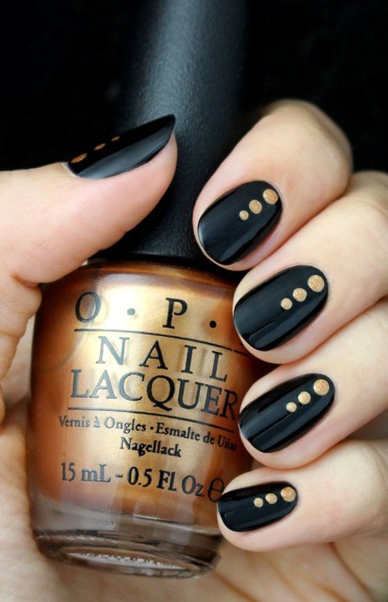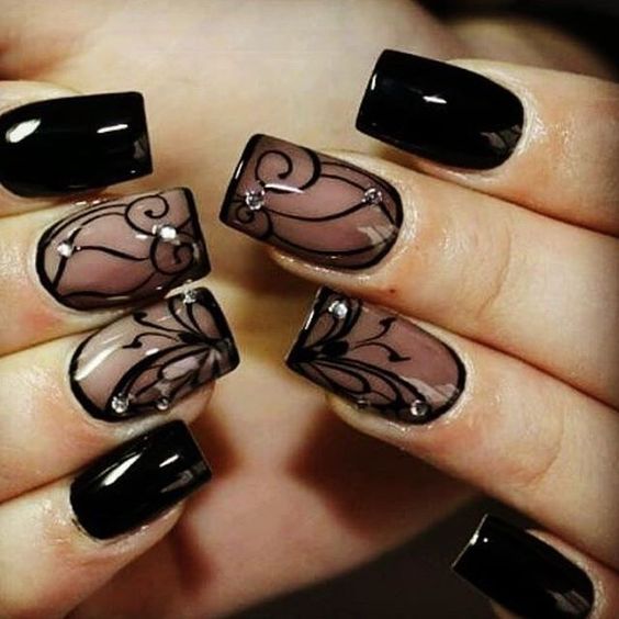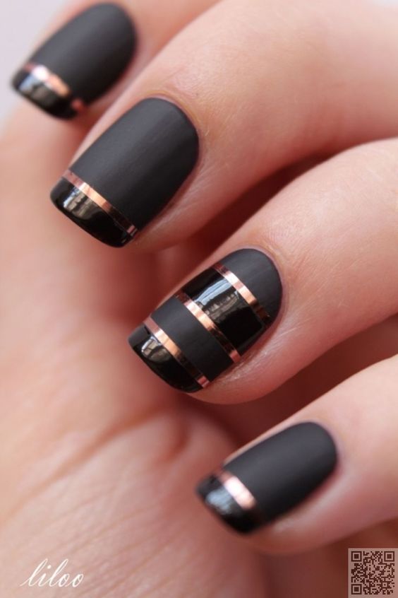 Le luxe des nuances précieuses sur un fond noir semble incroyable. Des paillettes holographiques argentées et dorées, des fils, du scotch, du papier d'aluminium et d'autres pièces brillantes de décorations pour les ongles sont souvent utilisées pour créer un look spectaculaire en soirée. Les éléments de décoration brillants diluent merveilleusement le dessin des ongles noir nuit. Les fantasmes sont infinis. Des ornements graphiques brillants sont appliqués sous la forme de lignes chaotiques, de formes géométriques, de motifs dispersés. La couche de base doit être monophonique, comme la couleur de la suie, sinon les étincelles risquent de se perdre dans le dessin.