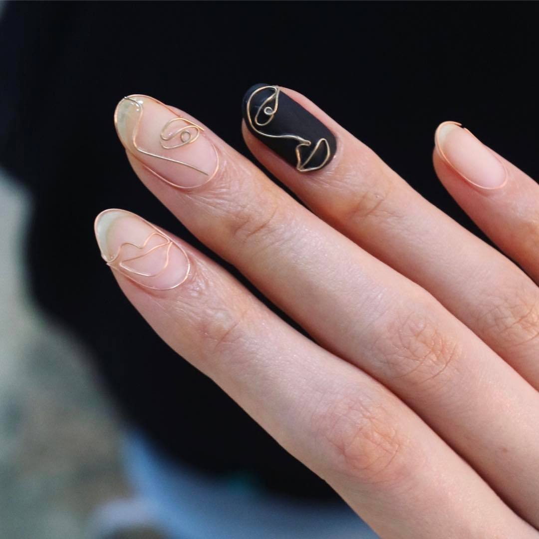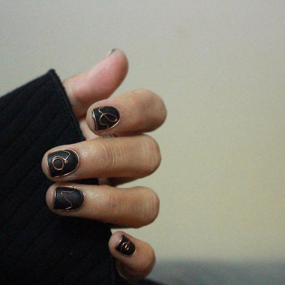 Une conception inhabituelle et sensuelle des ongles avec un revêtement noir peut être obtenue en décorant avec un fil spécial pour le design. Ne soyez pas surpris! Le fil à clous spécial n'apportera absolument aucun inconfort.
