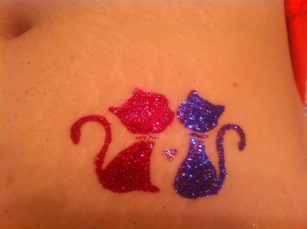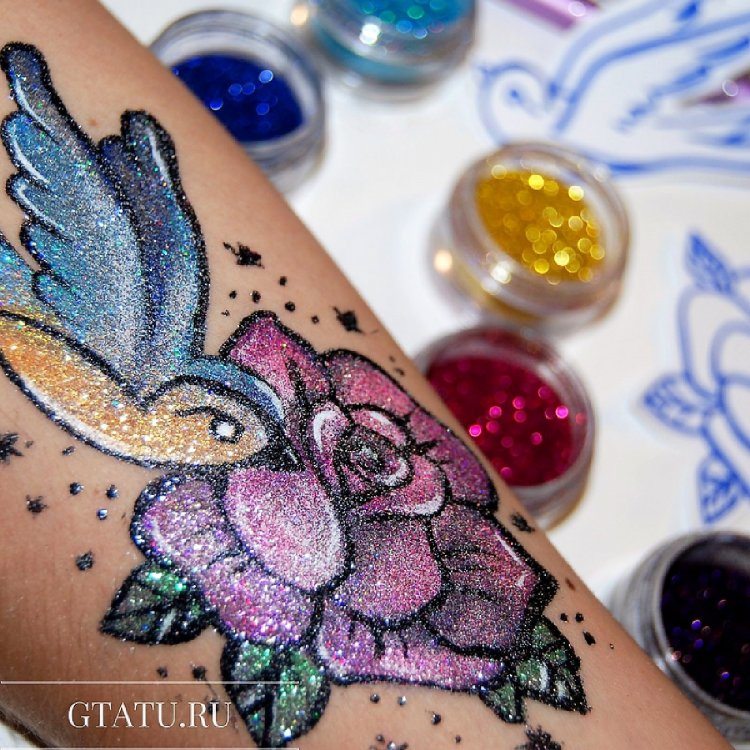 C'est une colle imperméable à l'eau qui assure la manifestation d'un tatouage pendant une période déterminée. Avec une attitude prudente vis-à-vis du motif brillant, il reste sur le corps pendant un mois maximum, après quoi il perd progressivement son apparence d'origine pour ensuite disparaître complètement. Un autre grand avantage des tatouages à paillettes est que vous pouvez vous en débarrasser à tout moment. Ainsi, les dessins à volonté peuvent être changés au moins tous les jours. Ce type de tatouage ouvre de nombreuses possibilités d'expérimentation sur vos images. Après avoir terminé un tatouage temporaire, vous pouvez voir à quoi ressemblera le présent sur telle ou telle partie du corps. Alors n'hésitez pas à décider de décorer le corps de cette façon.