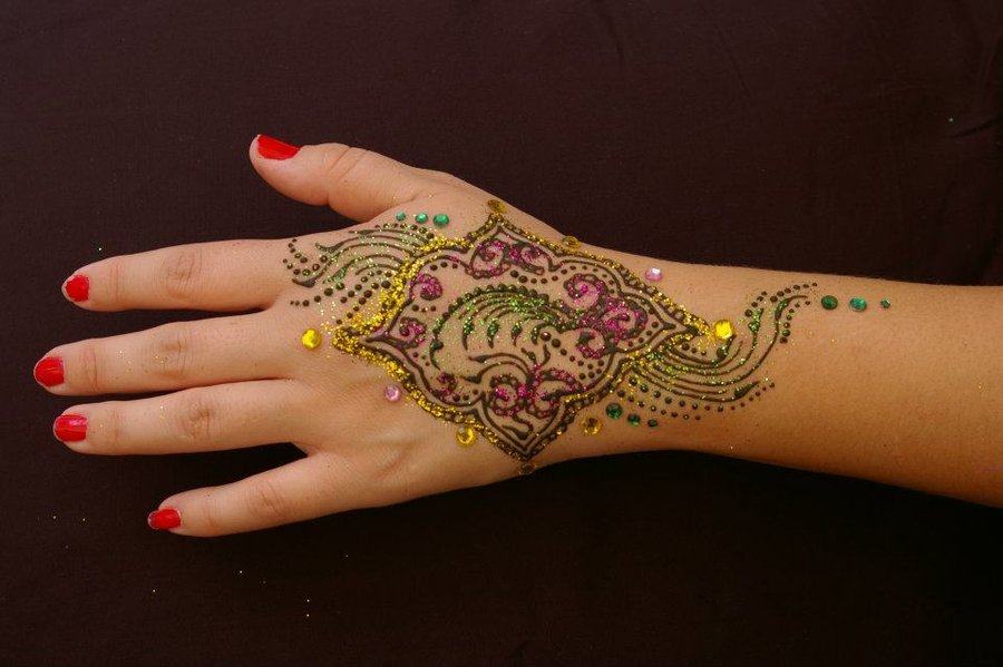 Il est très simple de créer un tatouage élégant à l'aide d'étincelles, cela peut être fait même à la maison. Au départ, vous devez choisir votre pochoir préféré et appliquer de la colle spéciale sur la zone sélectionnée du corps. La prochaine étape consistera à appliquer les étincelles: vous devez saupoudrer les étincelles sur le corps et éliminer le résidu avec un pinceau ordinaire. Un tatouage attrayant et pétillant est complet. Il est à noter que cette méthode n'a pas d'effets secondaires et est totalement inoffensive pour la peau. La colle elle-même est imperméable, ce qui explique pourquoi le tatouage dure environ 14 jours sur le corps, et avec un rapport précis, il est plus long. Si vous avez des compétences artistiques, un pochoir n'est pas nécessaire. Tout ce que vous avez à faire est d'appliquer votre dessin au pinceau préféré.