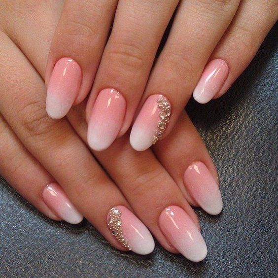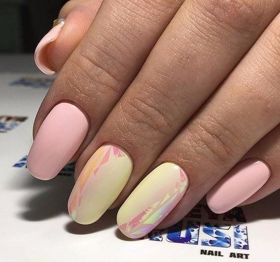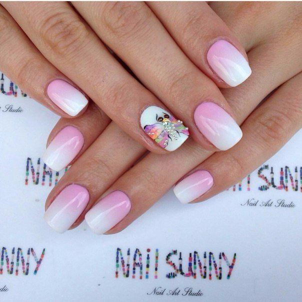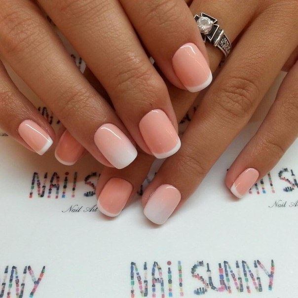 En outre, un dégradé horizontal peut être utilisé comme accent. Autrement dit, tous les ongles, sauf un ou deux, doivent avoir un revêtement uniforme. Le plus approprié dans ce cas sera les couleurs pastel. Cependant, d'autres options sont possibles.